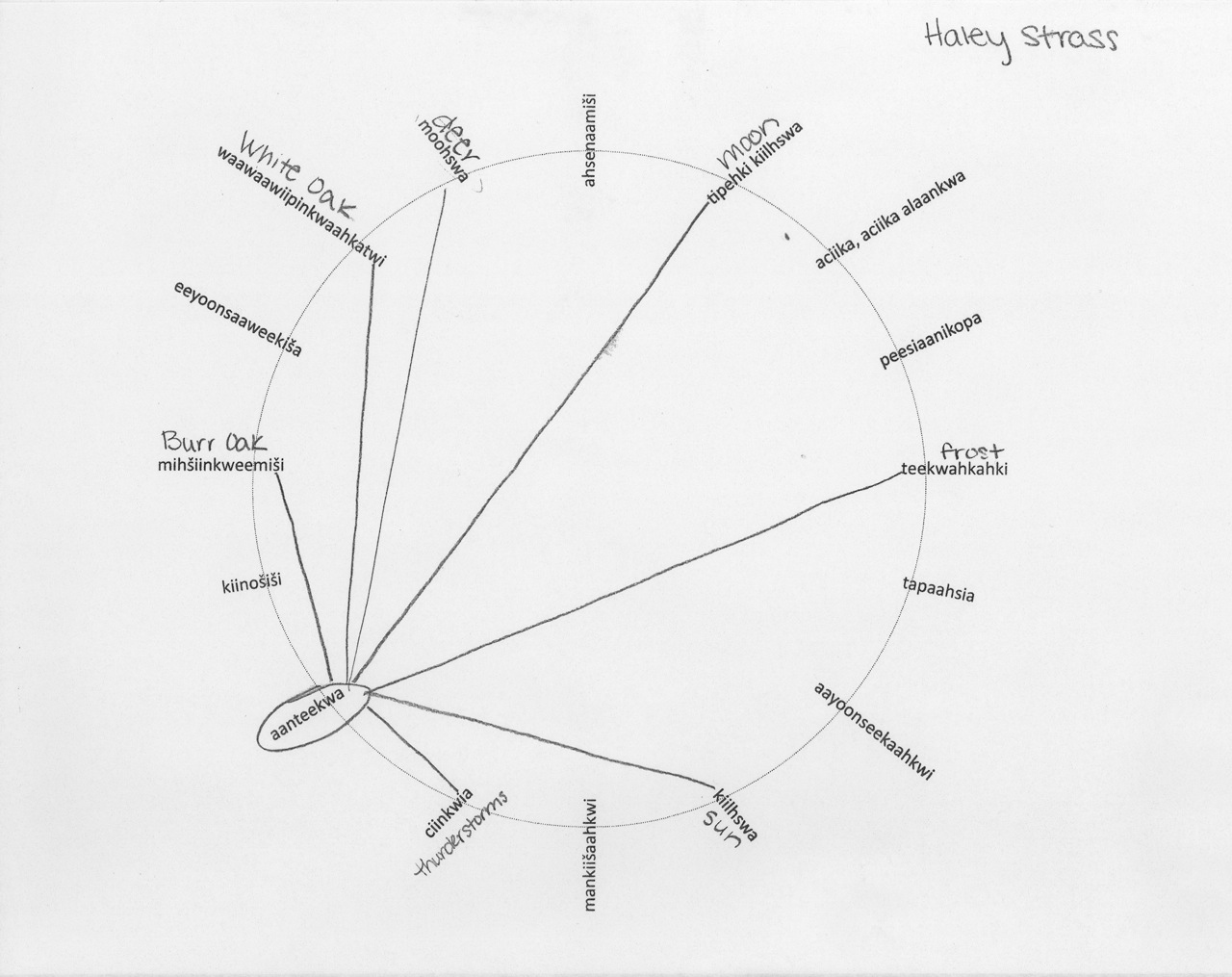 What follows is a record of a student’s observations from kišiinkwia kiilhswa (July/August 2009) to cecaahkwa kiilhswa (April/May 2010). Each student was asked to observe one feature (plant, tree, animal, celestial body, or weather phenomena) and its connections to other features. In addition each student was asked to visually represent these connections by constructing a visual web.