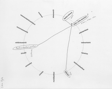 What follows are recordings of student observations from kišiinkwia kiilhswa (July/August 2009) to cecaahkwa kiilhswa (April/May 2010). Each student was asked to observe one feature (plant, tree, animal, celestial body, or weather phenomena) and its connections to other features. In addition each student was asked to visually represent these connections by constructing a visual web.