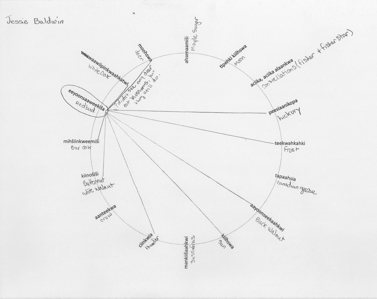 What follows are recordings of student observations from kišiinkwia kiilhswa (July/August 2009) to cecaahkwa kiilhswa (April/May 2010). Each student was asked to observe one feature (plant, tree, animal, celestial body, or weather phenomena) and its connections to other features. In addition each student was asked to visually represent these connections by constructing a visual web.
