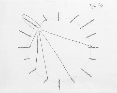 What follows are recordings of student observations from kišiinkwia kiilhswa (July/August 2009) to cecaahkwa kiilhswa (April/May 2010). Each student was asked to observe one feature (plant, tree, animal, celestial body, or weather phenomena) and its connections to other features. In addition each student was asked to visually represent these connections by constructing a visual web.