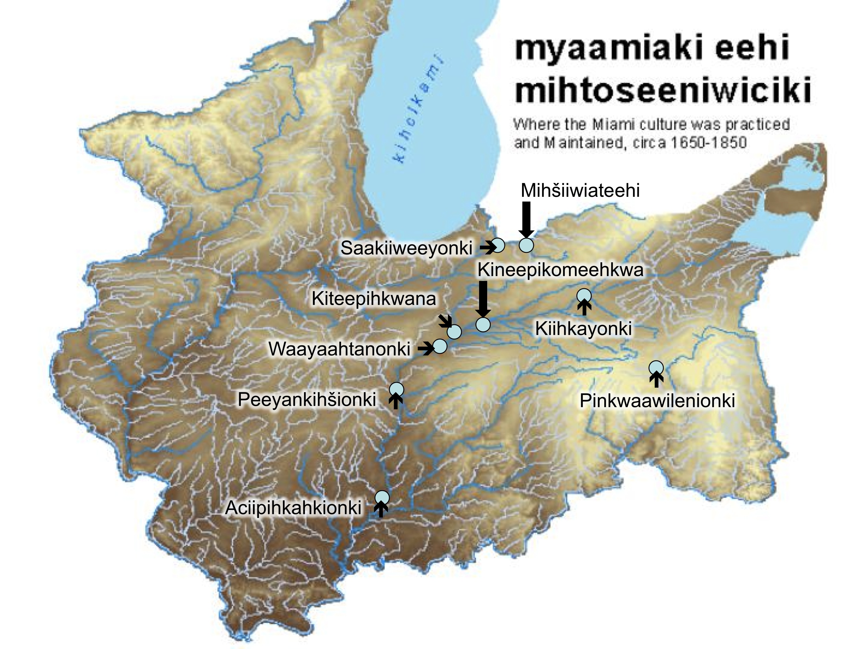 [2] Helen Hornbeck Tanner and Miklos Pinther, Atlas of Great Lakes Indian History (Civilization of the American Indian series; v. 174. 1st ed. Norman: Published for the Newberry Library by the University of Oklahoma Press, 1987), 32-33. C. C. Trowbridge, W. Vernon Kinietz, and Burton Historical Collection. Meearmeear Traditions (Ann Arbor: University of Michigan Press, 1938), 7-10.