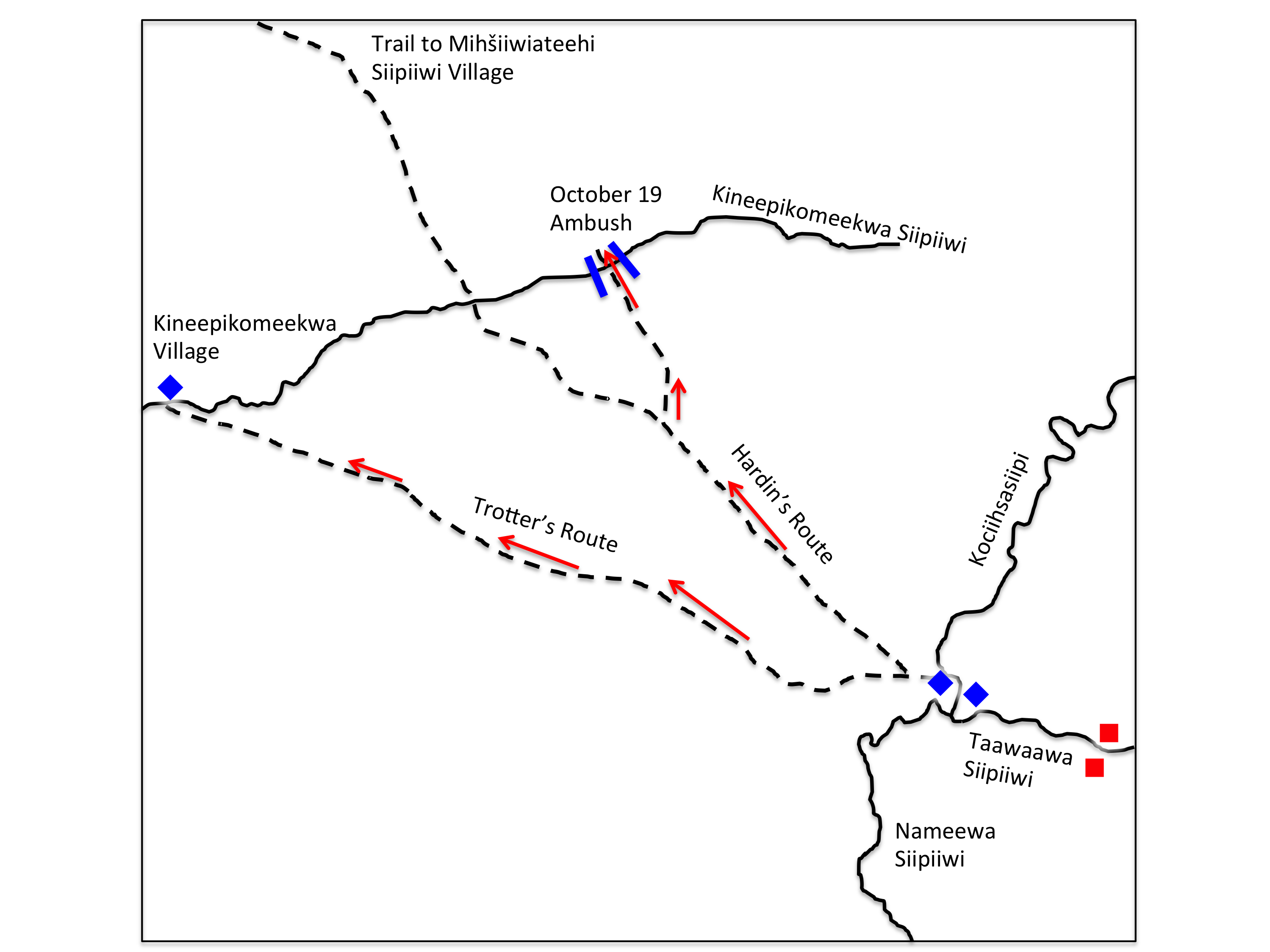On the following morning, Myaamia men were well aware of the 300 militia who marched out of the American camp. Harmar had ordered Lieutenant Colonel James Trotter to take 300 militia and a few U.S. Army regulars to the northwest of Kiihkayonki to try and locate the noncombatants who had been evacuated and attempt to engage in a battle or skirmish with the men from the villages. The Myaamia men had limited numbers and this required them to guess which of the two trails the Mihši-maalhsa would choose. On this day, they set their ambush on the trail leading to Mihšiiwiateehi Siipiiwi, where most of the village’s noncombatants had fled (see map below). They also stationed scouts on the other main trail, which lay just to their southwest. This southern trail led to the Kineepikwameekwa headwaters village, which the Mihši-maalhsa had left alone up to this point.[15]