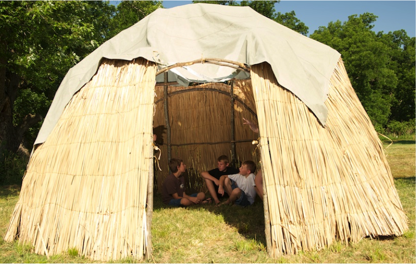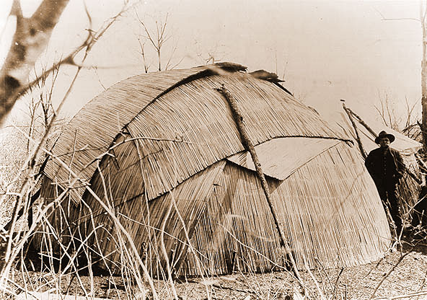 Over time, Myaamia people have lived in a wide variety dwelling types. The traditional home of the Myaamia is called wiikiaami. A wiikiaami is a domed structure that could be covered in cattail reed mats or bark depending on the season. Often these were also lined with bulrush mats, which were decorated. The layers of mats created an insulated space, which kept these dwellings warm and dry. Wiikiaami is often called a wigwam in English. Today, wiikiaami is a word that Myaamia people can use for any house or dwelling.