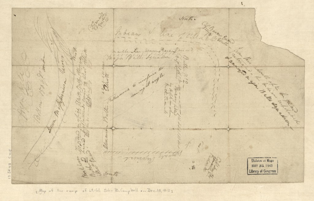 [3] “Vernon’s Memoir” in John C. Fredriksen, “The Pittsburgh Blues and the War of 1812: The Memoir of Private Nathaniel Vernon,” Pennsylvania History: A Journal of Mid-Atlantic Studies 56, no. 3 (1989): 199-200; Campbell to Harrison, Dec. 25, 1812, in Logan Esarey, ed., Governor’s Messages and Letters: Messages and Letters of William Henry Harrison, vol. 2, 1812- 1816 (Indianapolis: Indiana Historical Commission, 1922), 257; Campbell to Harrison, Dec. 18. 1812 in Esarey, ed., Governor’s Messages and Letters 2: 248-49.