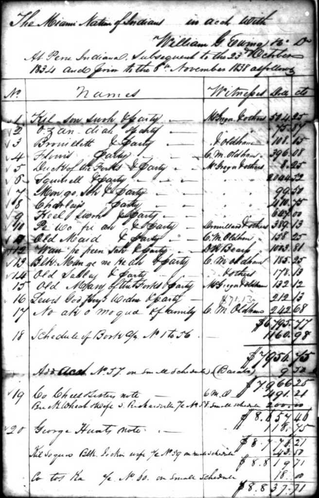 This page from a trader’s log shows some of the 1834-1838 debts of Miami bands to William Ewing, one of the traders we purchased items from. In today’s dollars, $8800 would be about $250,000.