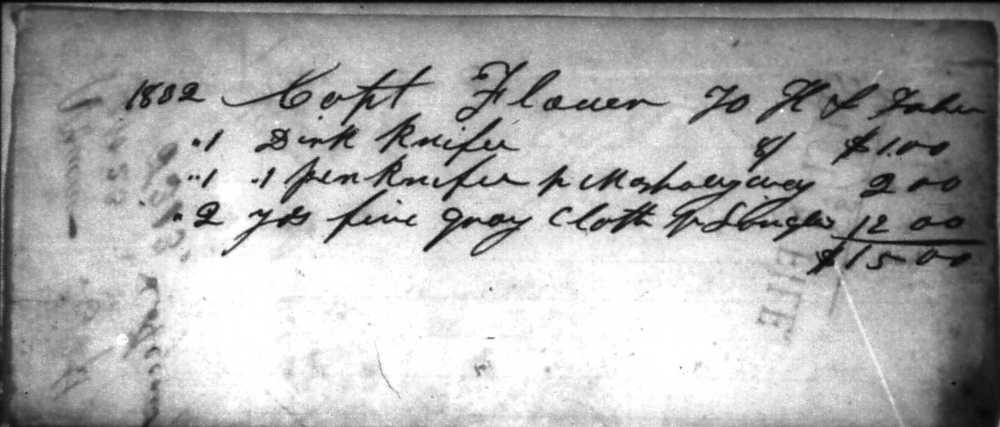 This trader’s log shows that Captain Flour ‘Noohkimina’ bought a Dirk knife for himself and a pen knife and fine gray cloth for others in 1832.