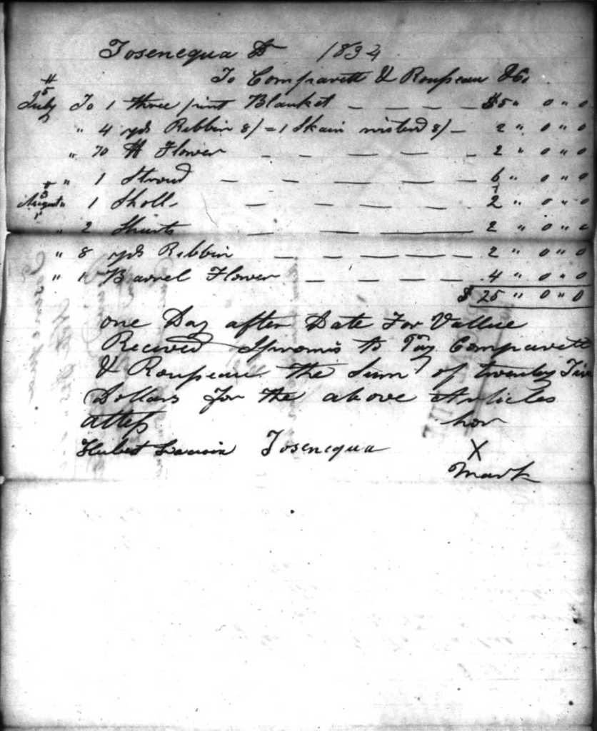 This trader’s log shows that Tosenequa ‘Mihtohseenihkwa’ bought ribbons, flour, shirts, and a shawl in July and August 1834.