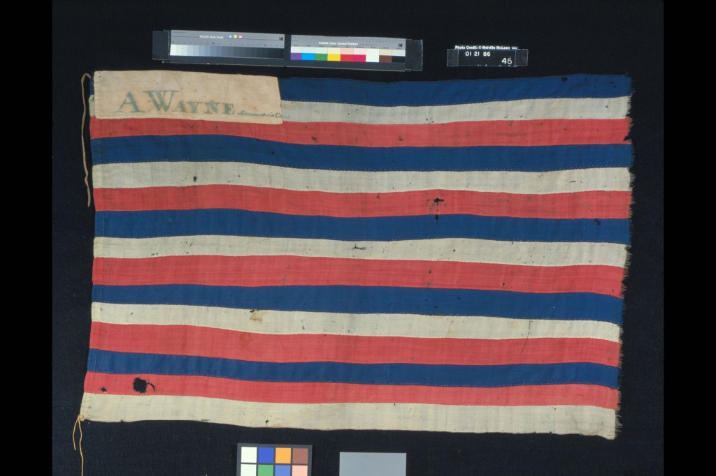 There is no specific record that states when Anthony Wayne gifted this flag to Šimaakanehsia. It could have happened when he came in to make peace following the Battle of the Maumee (Fallen Timbers) or at the conclusion of the Treaty of Greenville in the summer of 1795. Kiilhsoohkwa’s recollection of the purpose of the gift of the flag accurately reflects the way many other treaty gifts are explained. In this time period, travel back and forth between villages and treaty sites came with considerable risk. Šimaakanehsia’s flag may have been displayed while traveling to ensure safe passage from United States troops and their affiliated militias.