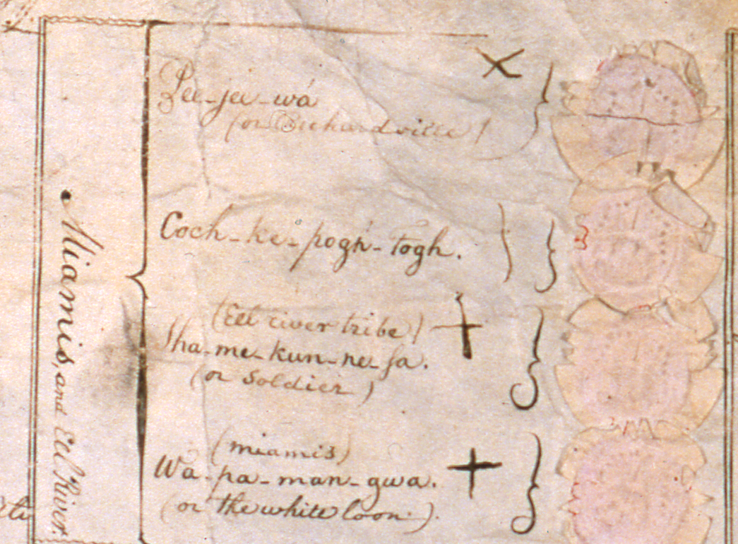 Kiilhsoohkwa was the granddaughter of two well-known Myaamia leaders: Mihšihkinaahkwa ‘Little Turtle’ on her father’s side and Šimaakanehsia on her mother’s side. Both men were war leaders who fought on behalf of their villages and their tribal nation. Both men also became peace makers and were signers of the Treaty of Greenville (1795) and both were presented with gifts by Anthony Wayne on behalf of the United States. Mihšihkinaahkwa is a fairly well-known Myaamia leader outside of our community, but Šimaakanehsia has not received a lot of attention in popular or academic history.