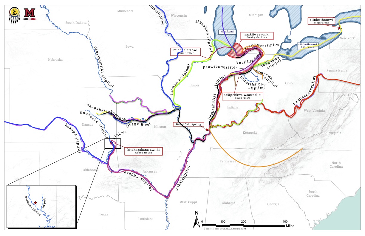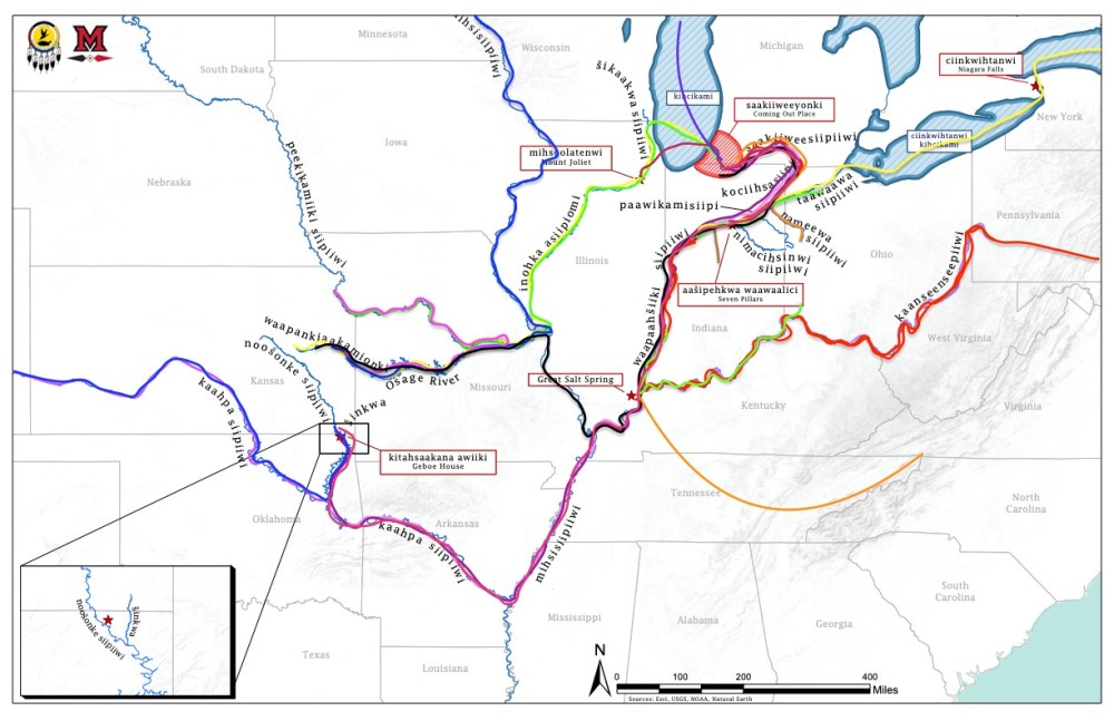 Participants from Eewansaapita and Neehsapita learned about the three core rivers of Myaamionki: Waapaahšiiki Siipiiwi ‘Wabash River,’ Waapankiaakami ‘Marais des Cygnes River,’ and Noošonke Siipiwi ‘Neosho River.’ During this discussion, participants identified the river closest to their location and how to navigate the rivers to reach one of these core rivers. We also listened to Jarrid Baldwin recount our Coming Out Story which refers to Saakiiweeyonki ‘Coming Out Place’ along the Saakiiweesiipiiwi ‘St. Joseph River (Lake Michigan).’ Participants in each program worked together to navigate the rivers in order to meet at Saakiiweeyonki.