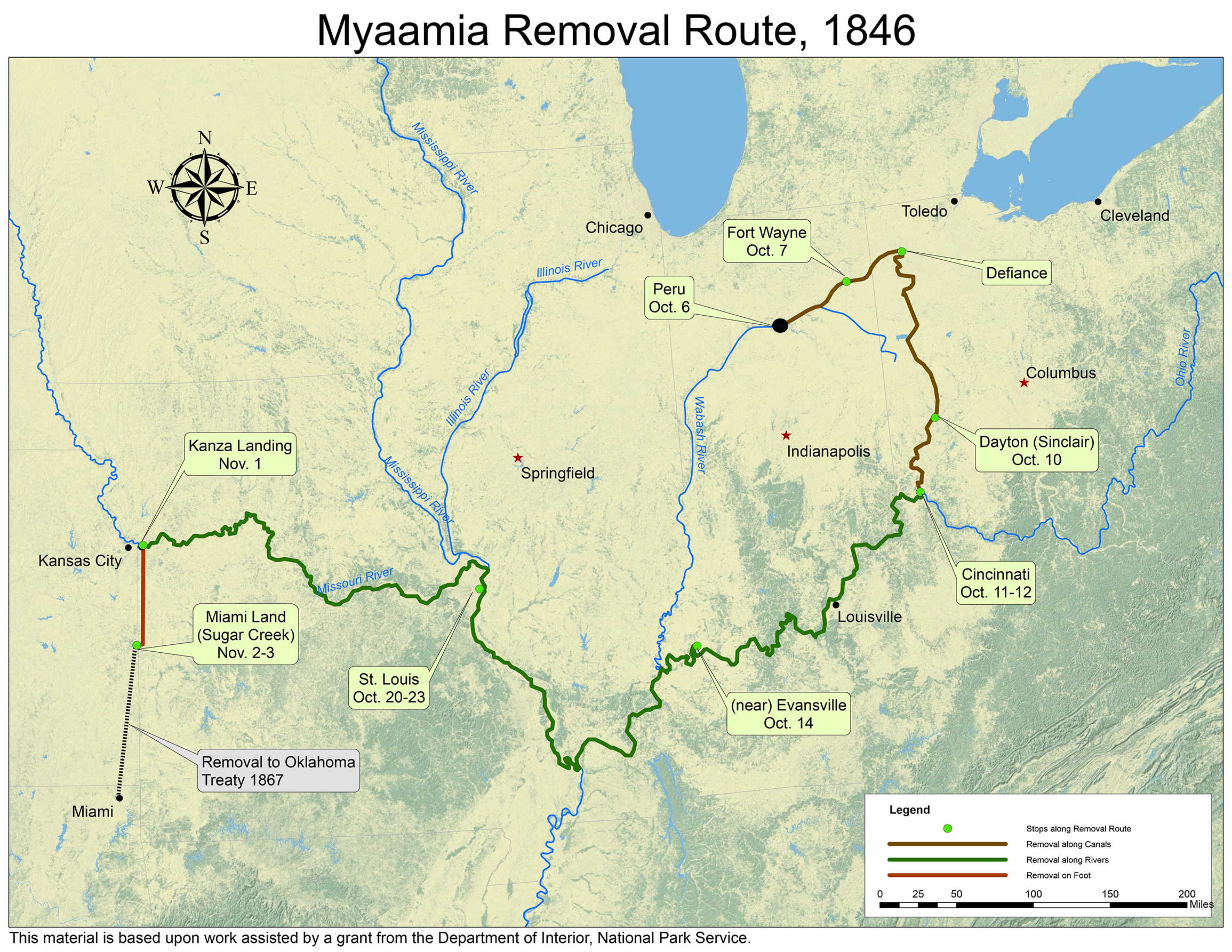 Map by Kristina Fox with annotations by Diane Hunter from George Strack, et al., myaamiaki aancihsaaciki: A Cultural Exploration of the Myaamia Removal Route (Miami, OK: Miami Tribe of Oklahoma, 2011), which was supported by a National Park Service Historic Preservation Grant (#40-09-NA-4047)