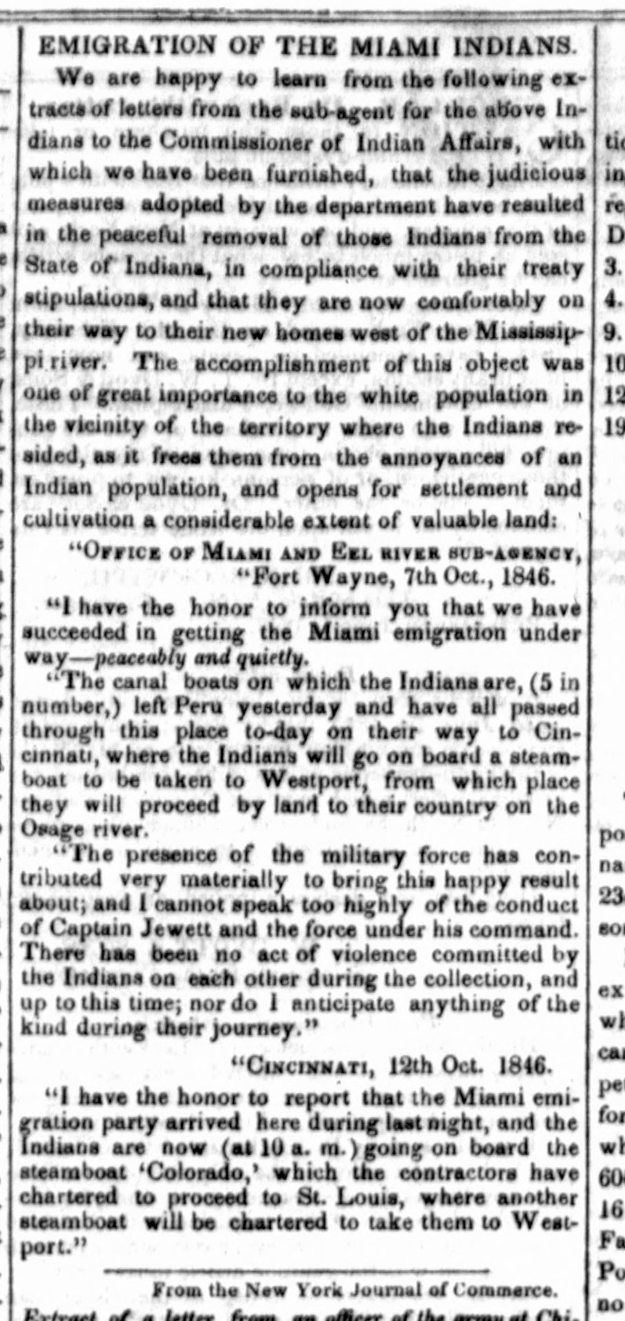 Trader William Ewing wrote to Commissioner of Indian Affairs William Medill from Cincinnati that the Miami Nation left Cincinnati yesterday. He noted that those who had been sick were recovering. We will see about that in later posts.