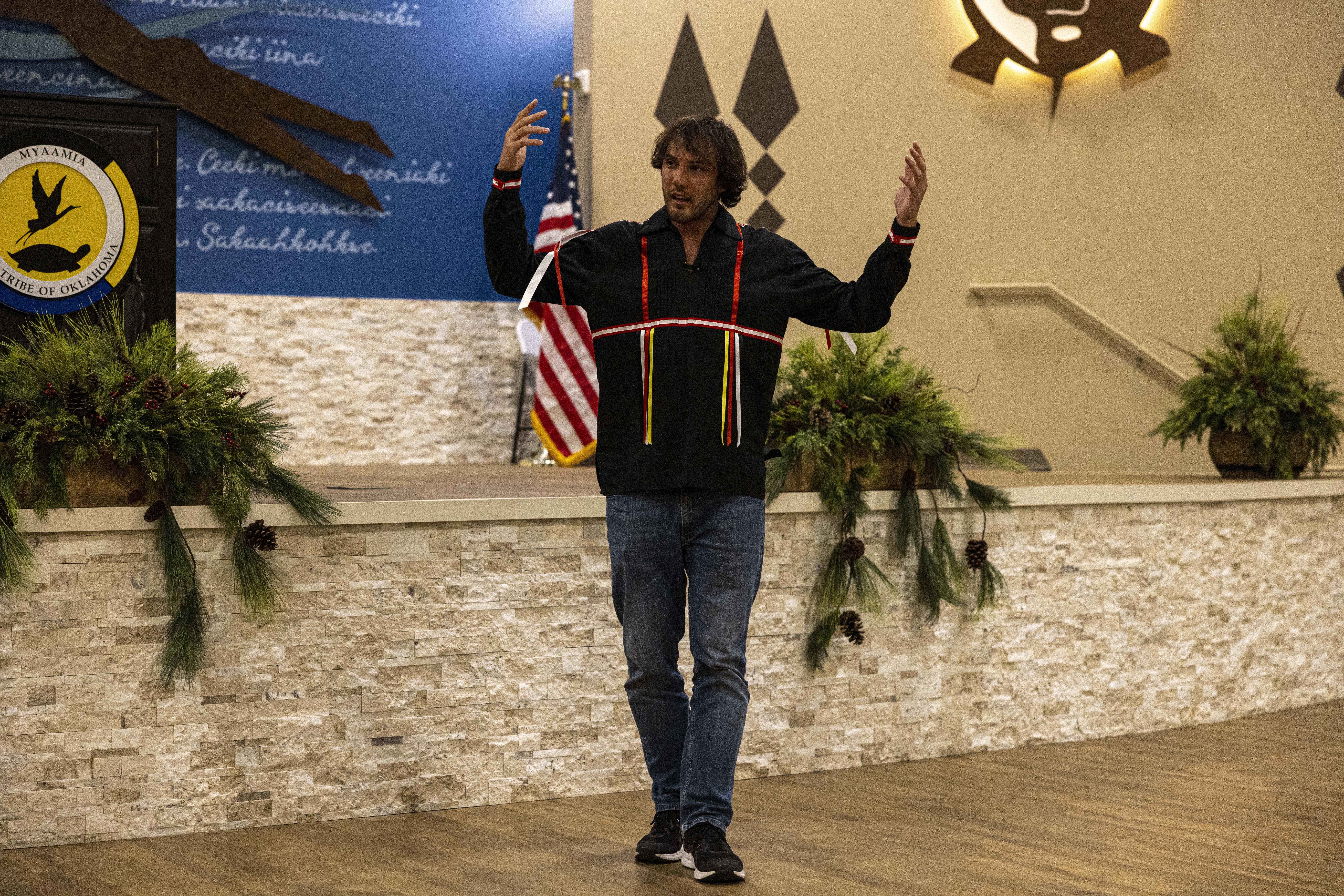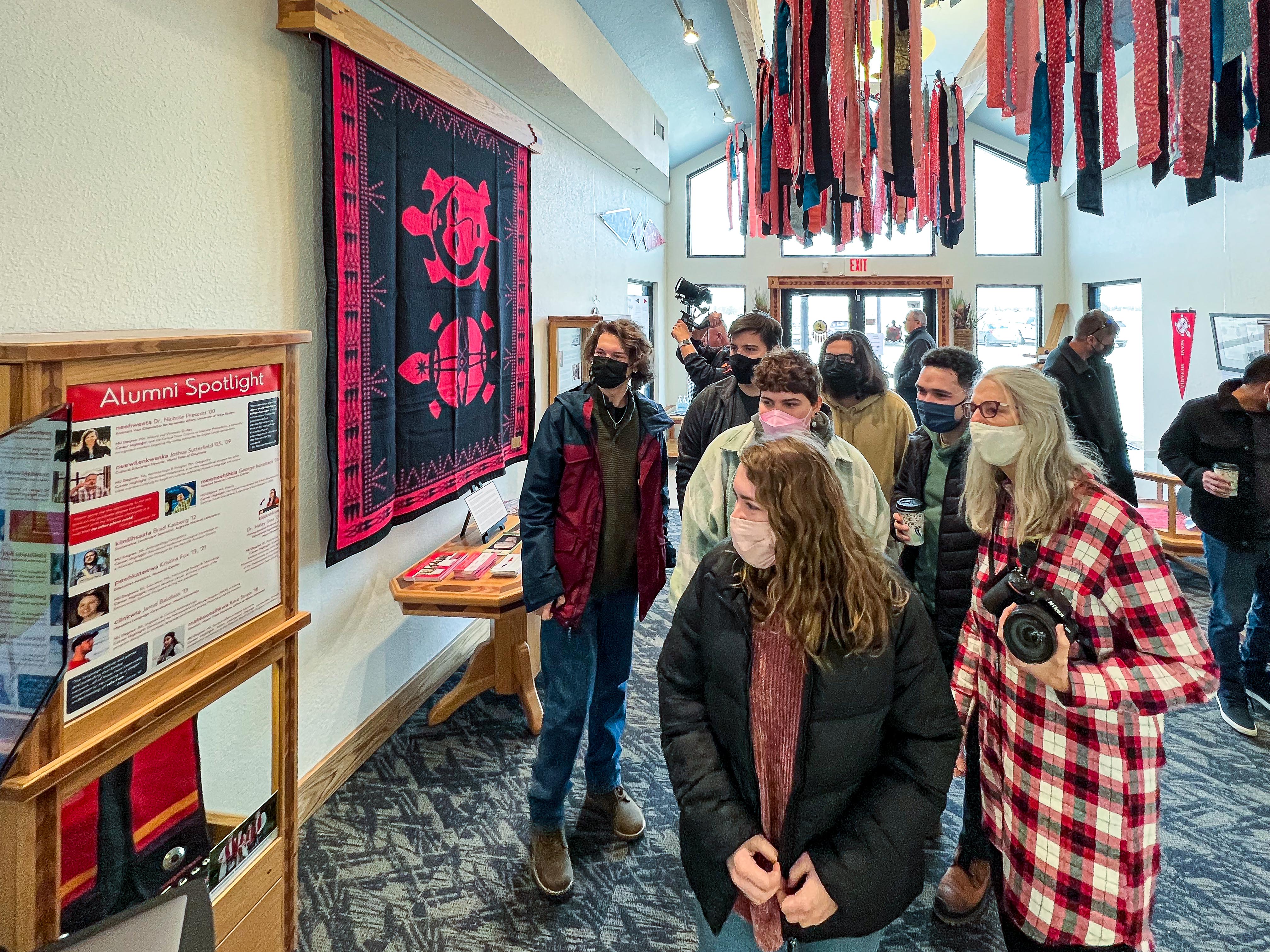 The event was held on the last weekend of January. On Friday, the first day’s events began in the Aacimweekaani ‘Council House,’ a central building for tribal meetings, with an opening welcome from Akima, Chief Doug Lankford. He expressed the Tribe’s commitment to hold these events for those that are able and wish to attend going forward and his excitement to share in the weekend’s events with the attendees. Afterwards, attendees were able to walk through the newly re-designated Mildred Walker Cultural Resource Offices just next door, which was previously the Elder Activity Center. The lobby held an exhibition for the 50th Anniversary of the Tribe and University’s relationship. Hanging from the ceiling were also a collection of fabric ribbons that commemorated the Myaamia citizens that underwent Removal, the 175th anniversary of which occurred last year.