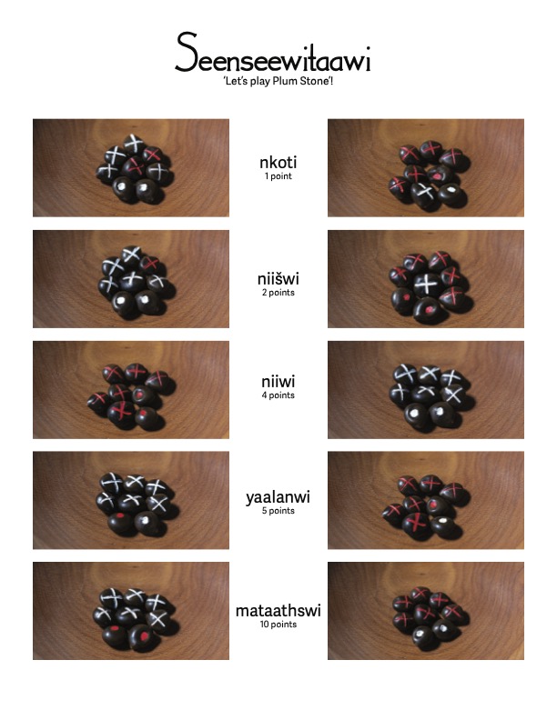 Seenseewinki doesn’t require too many pieces of equipment. All you will need is, of course, an alaakani, ‘bowl’, and seenseeminiiki, ‘plum stones’. The seenseeminiiki are your game pieces, though instead of plum stones we now often use Kentucky coffee beans.