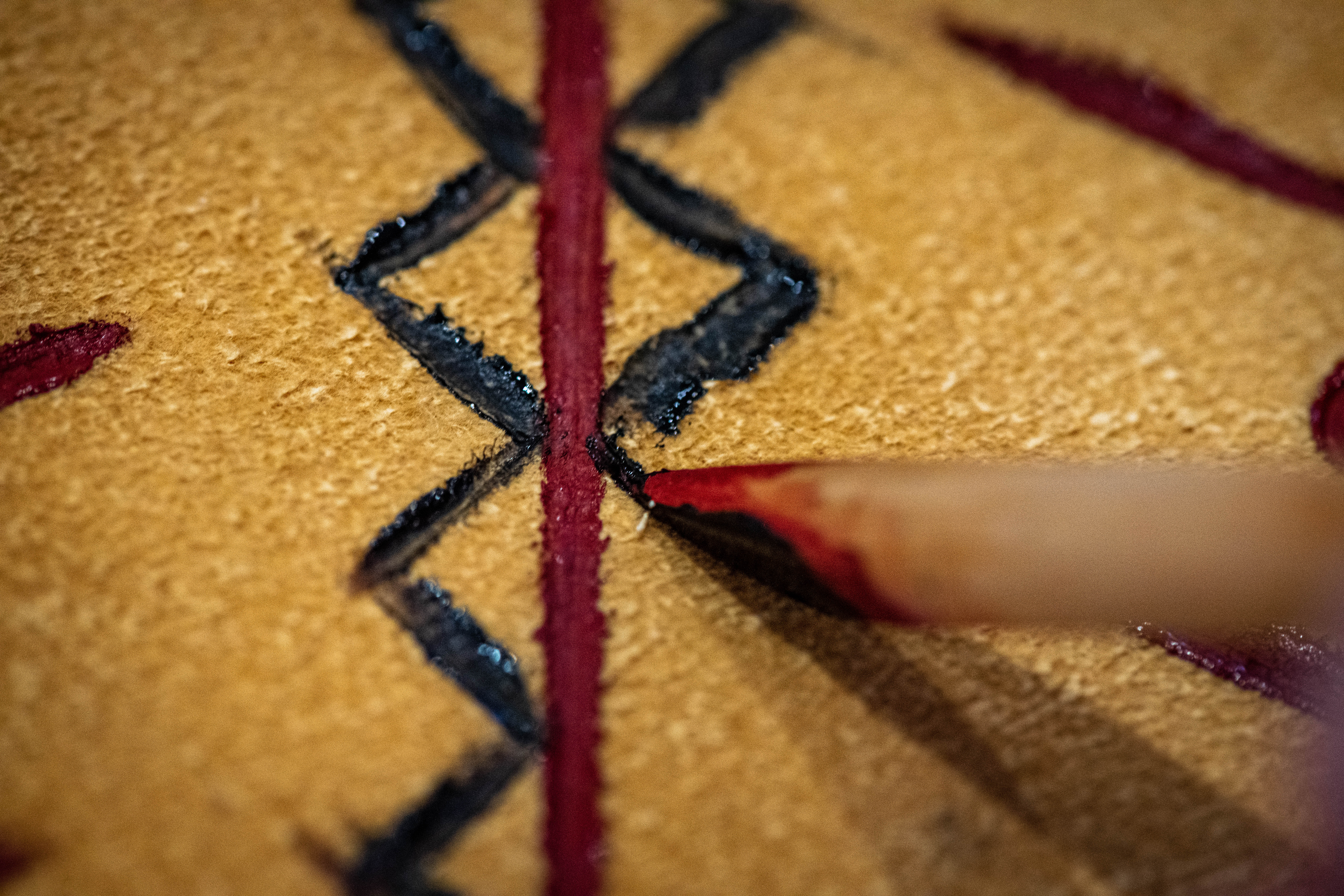 In addition to the enjoyment of being together as Miami and Peoria citizens and allies, the summit included several learning sessions. Two highlights were collaborator and artist Jamie Jacobs (Tonawanda Seneca) discussing artistic change over time in his community, and Michael Galban (Washoe/Mono Lake Paiute) helping us to make paint from alamooni ‘ochre’ and design tobacco pouches from brain-tanned deerskin. Michael is the manager and curator of the Ganondagan State Historic Site’s Seneca Art & Culture Center in upstate New York. We all feel a deep sense of gratitude to Michael and Jamie for traveling to Miami, Oklahoma and sharing their knowledge with us.