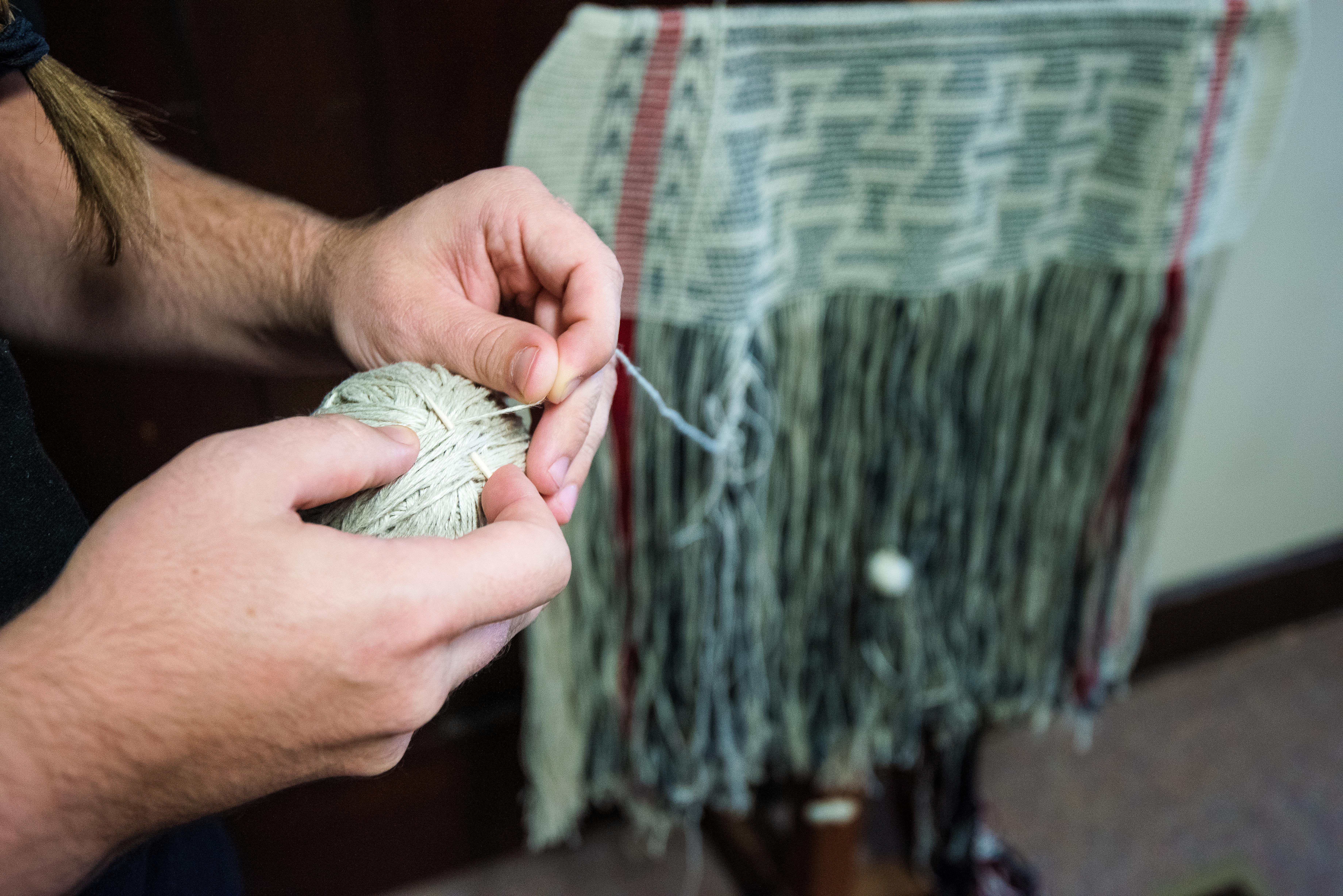 Jared: I think my identity as a weaver, and part of my journey as a weaver and what I’m working towards is the ability to, and what I guess is an extension of essentially body sovereignty, to clothe myself. The idea that currently within our nation, we’re outsourcing how we clothe ourselves and that a lot of the other material parts of our community come from external sources. A lot of times that has environmental consequences. So, re-learning how to do some of these things is with the idea that in the future I will have the skills and materials to be able to clothe myself. That’s something that I think is really important when evaluating the success of my life, what I’m really working towards, not just as a weaver. I think part of that is re-learning how to have that connectedness to place. And until I’ve reconnected, until I’ve reestablished how a place can take care of me, I don’t feel like I quite belong to that place. And so, I think part of that journey is with cloth and learning how to clothe myself.