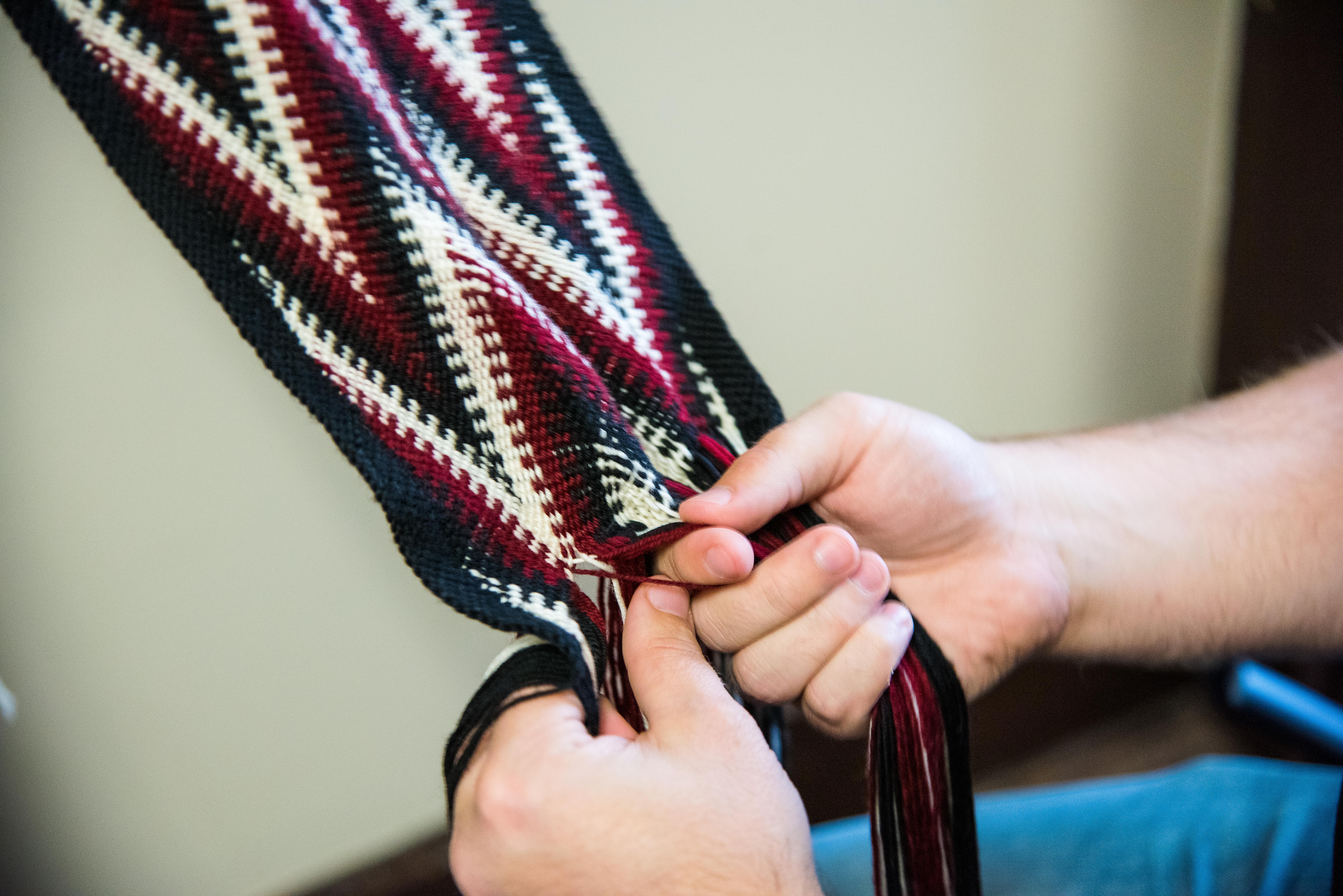 Jared: During my first semester at Haskell [Indian Nations University], I was really interested in doing traditional textile work. And so, I founded the Haskell Hand Weavers, a student club for all of us to come, participate, and share our different tribal textile traditions. We started out doing coil basketry, but from there, we got to participate in a fingerweaving workshop by Cindy Warrington, who’s Ho-Chunk. Several of our club members attended her workshop, and that is how I learned how to fingerweave garters and it was my introduction to Myaamia textiles.