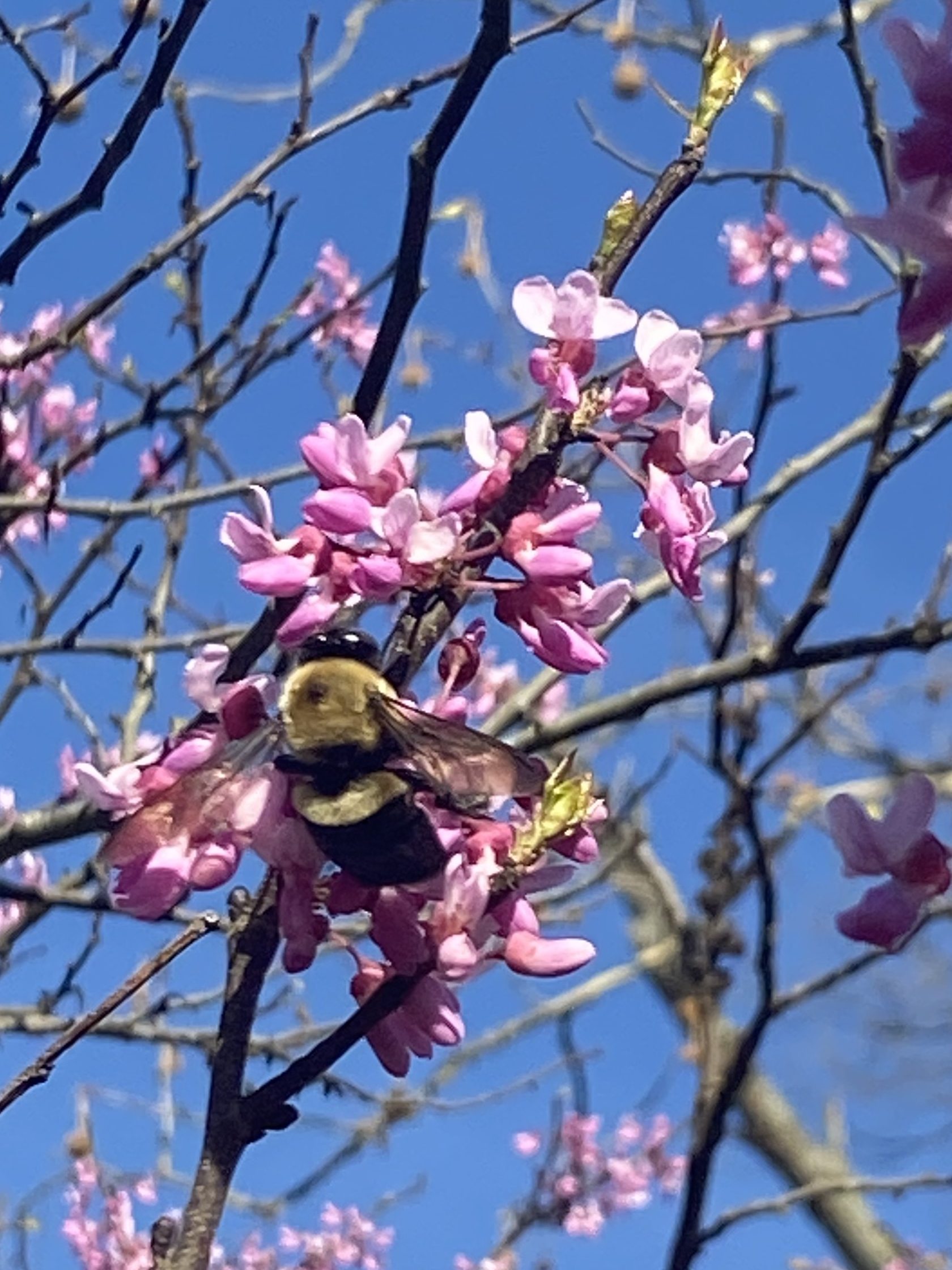 In addition to being beautiful, these trees are also important ecologically. As one of the first native flowering trees to bloom, these trees are invaluable to pollinators such as bees who will swarm the flowers as they begin to bloom. Additionally, the blooms are edible and can be eaten right off the tree or dried for later use. Eeyoonsaawikiša is part of the legume family, and later in the season, will form green seed pods, which are also edible when green and fresh. Eeyoonsaawikiša will develop broad, heart shaped leaves that turn yellow in the fall. The tree will hold on to its brown, dried seed pods long past the time that it loses its leaves.