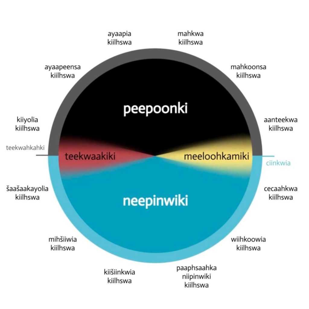 We are quickly moving out of aanteekwa kiilhswa ‘Crow Moon’ and into cecaahkwa kiilhswa ‘Sandhill Crane Moon,’ and the days are getting both longer and warmer. This period is called meeloohkamiki ‘spring’ in Myaamiaataweenki. However, meeloohkamiki is not viewed as a separate season, but instead a transitional period between peepoonki ‘winter’ and neepinwiki ‘summer’ in our seasonal system.