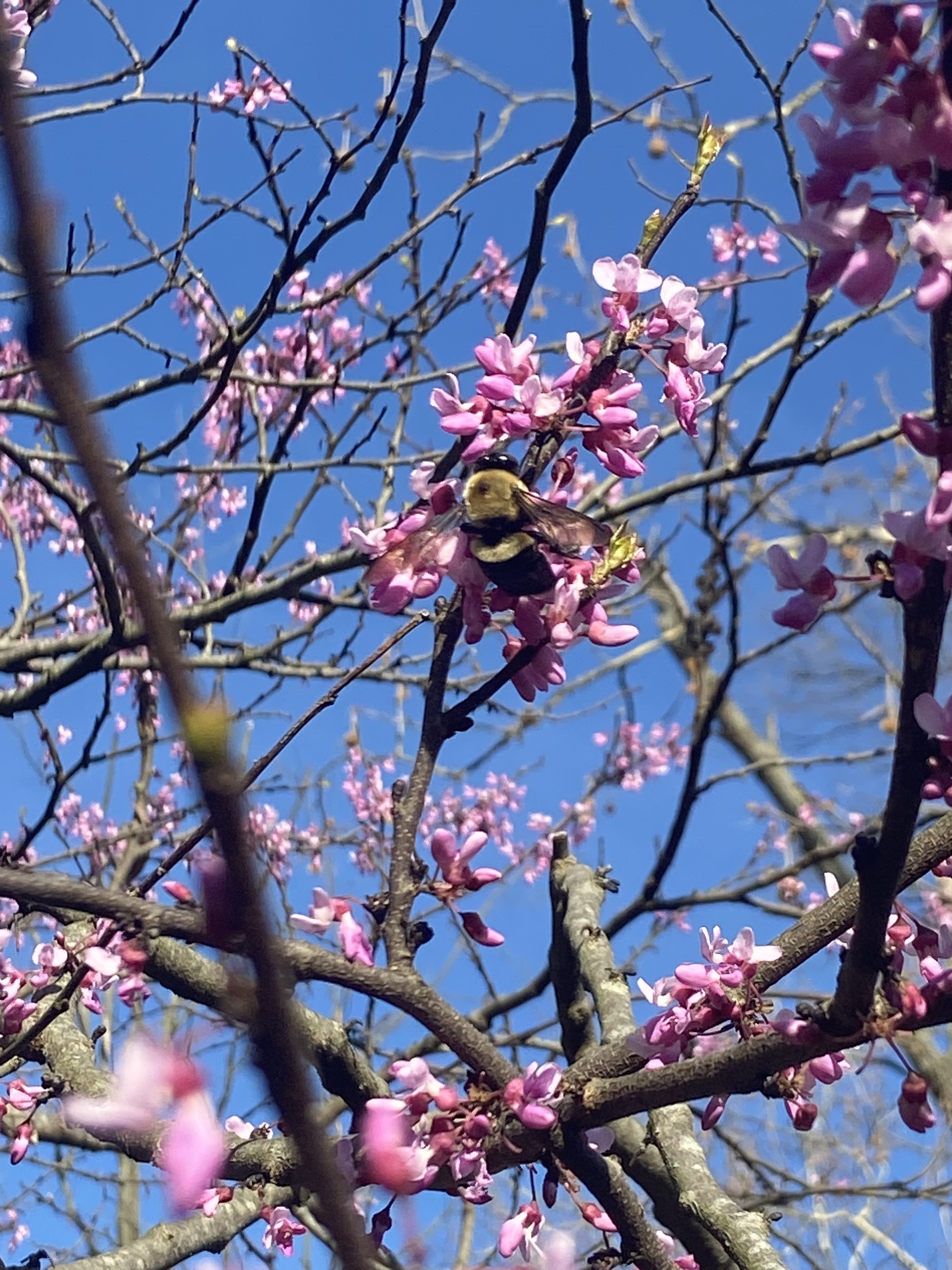 In addition to being beautiful, these trees are also important ecologically. As one of the first native flowering trees to bloom, these trees are invaluable to pollinators such as bees who will swarm the flowers as they begin to bloom. Additionally, the blooms are edible and can be eaten right off the tree or dried for later use. Eeyoonsaawikiša is part of the legume family, and later in the season, will form green seed pods, which are also edible when green and fresh. Eeyoonsaawikiša will develop broad, heart shaped leaves that turn yellow in the fall. The tree will hold on to its brown, dried seed pods long past the time that it loses its leaves.