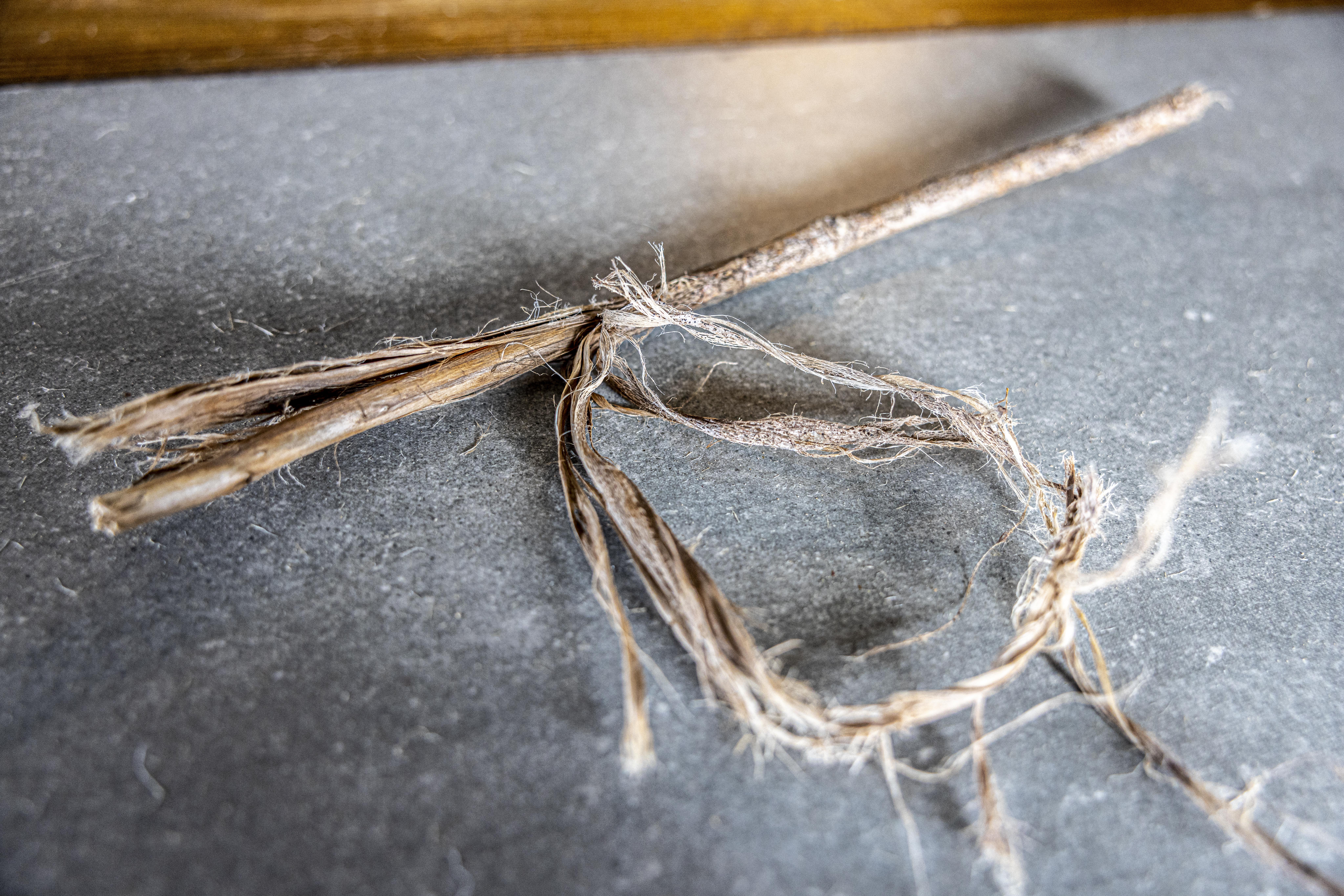Fiber is the foundation of thread. Unspun fibers have their uses — for example, lashing wiikiaami poles — but fibers are often spun or rolled into thread to add strength. The process of turning plants into fiber and finally to thread can be surprisingly complex. My work is just starting to explore some of the ecological relationships used to physically, ethically, and culturally harvest materials. Harvested materials then need to be processed to separate inner fibers from woody plant material, a process that can span weeks. From there, fibers are rolled or spun into thread. This can take as long or even longer than the time spent weaving.[2]