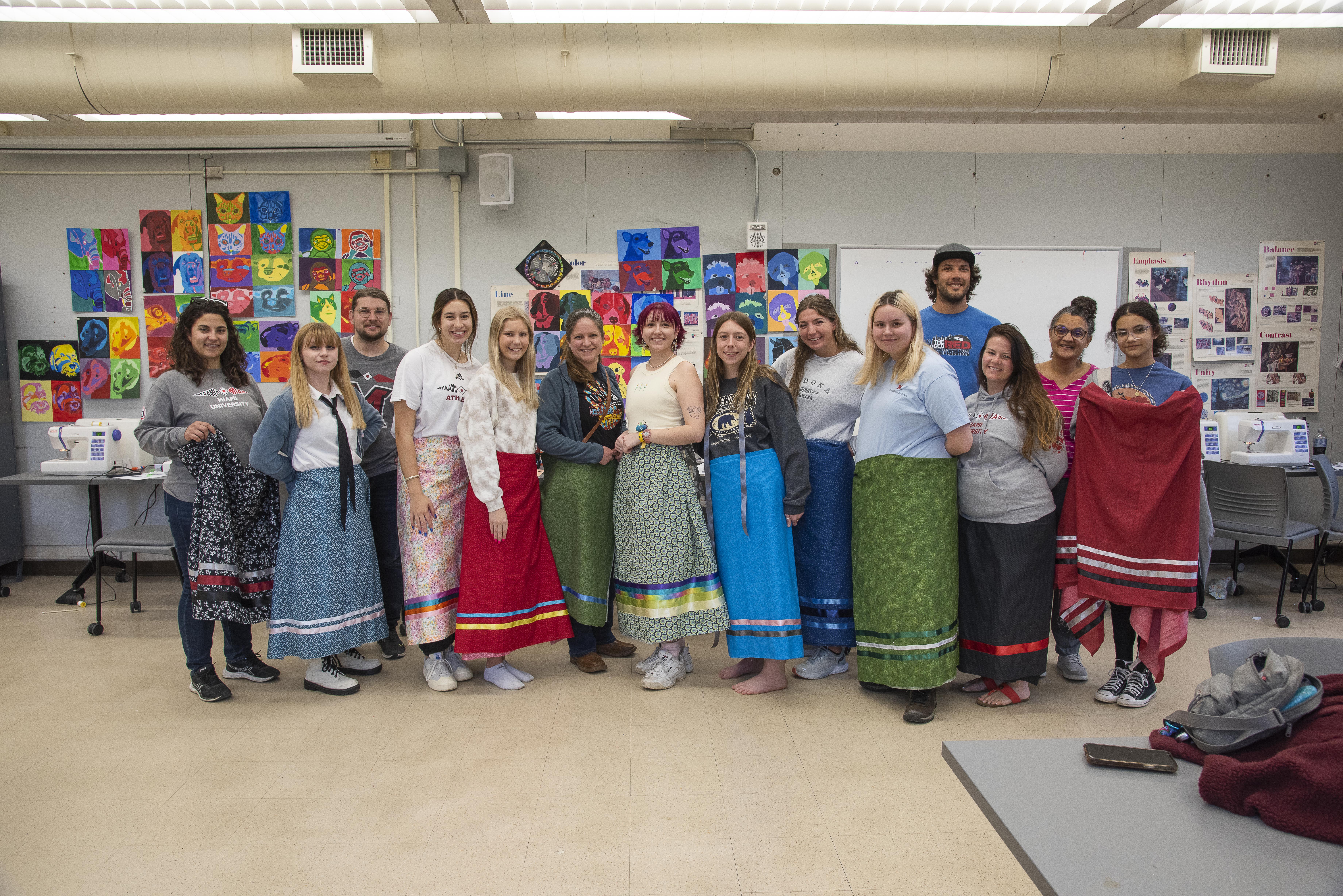 Throughout the spring, the Myaamia Center hosted a number of workshops and cultural experiences for Myaamia Heritage Program students. Karen Baldwin led two workshops, teaching students how to make ribbonwork and ribbon skirts for stomp dance.