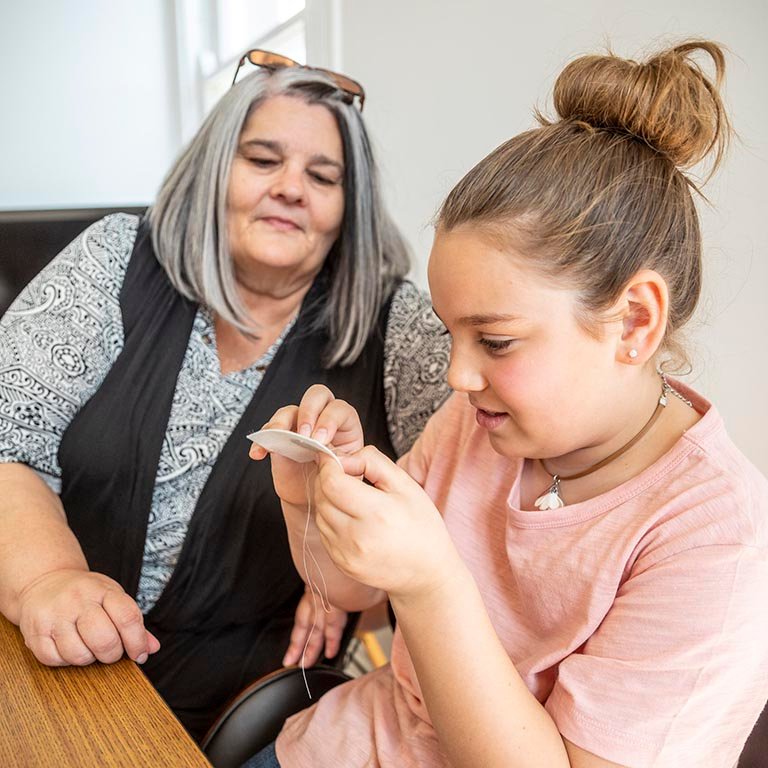 But then a few years after Sayiah, I had the chance to do it again, and I decided to work with Josie, Rachel’s daughter. Josie has really grabbed on to it. She really loves the arts, and she loves beading. I think she loves learning about where beadwork comes from and it also gives me a chance when we’re beading to talk to her about other things. While we work, she’s trying to teach grandma the language. She’s done the language camp for 5 years now, so she’ll say words to me and then I mess them up and then she corrects me, and I try to say it again. So we’re not only working on beadwork. We’re working on other parts of our culture, too, while we’re sitting together. And then I’ll tell her stories, because even my story, from when I was younger, that’s part of our history. What you girls are doing at Miami University is becoming our history, and it’s a huge part of our history. Our history is being made right now.
