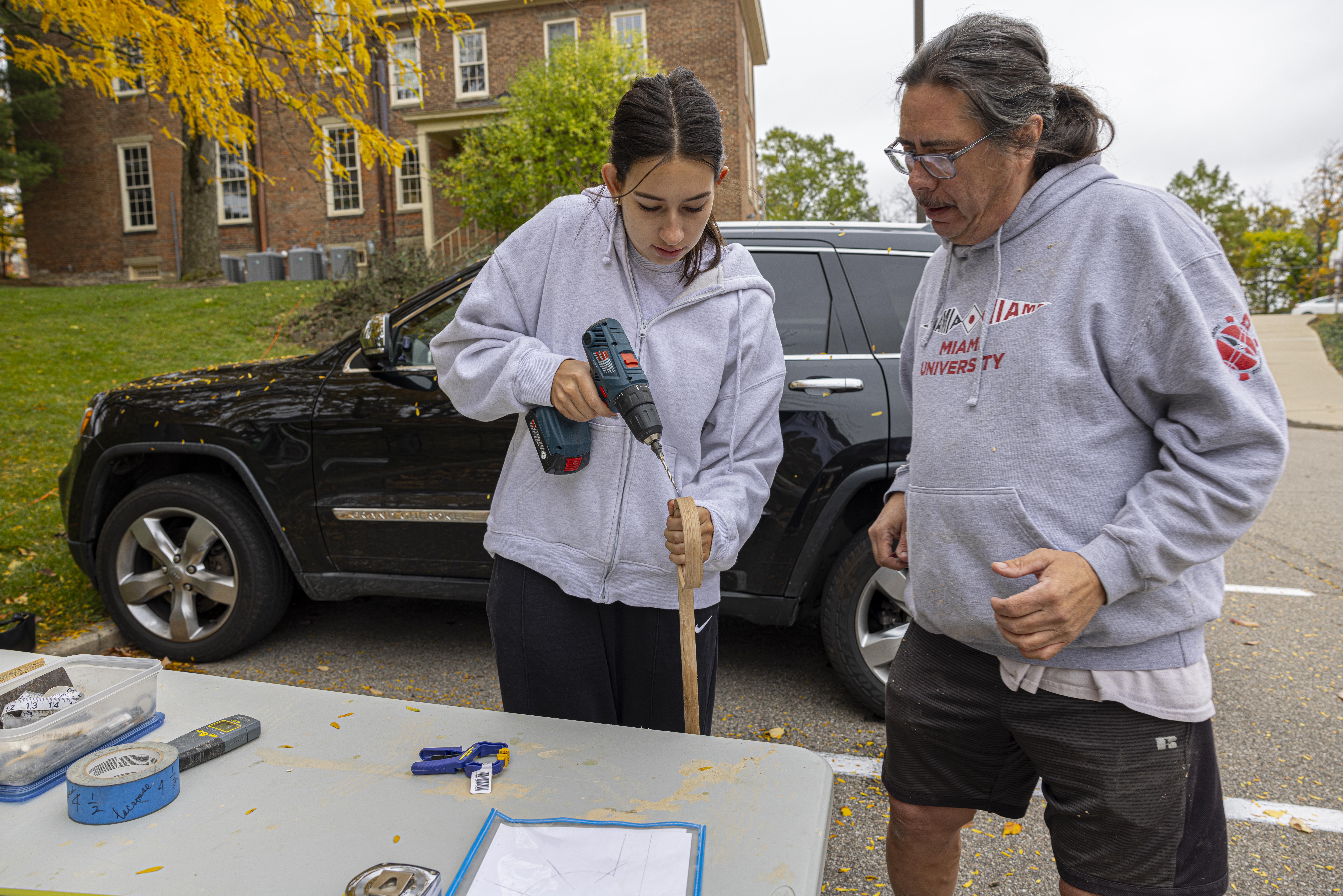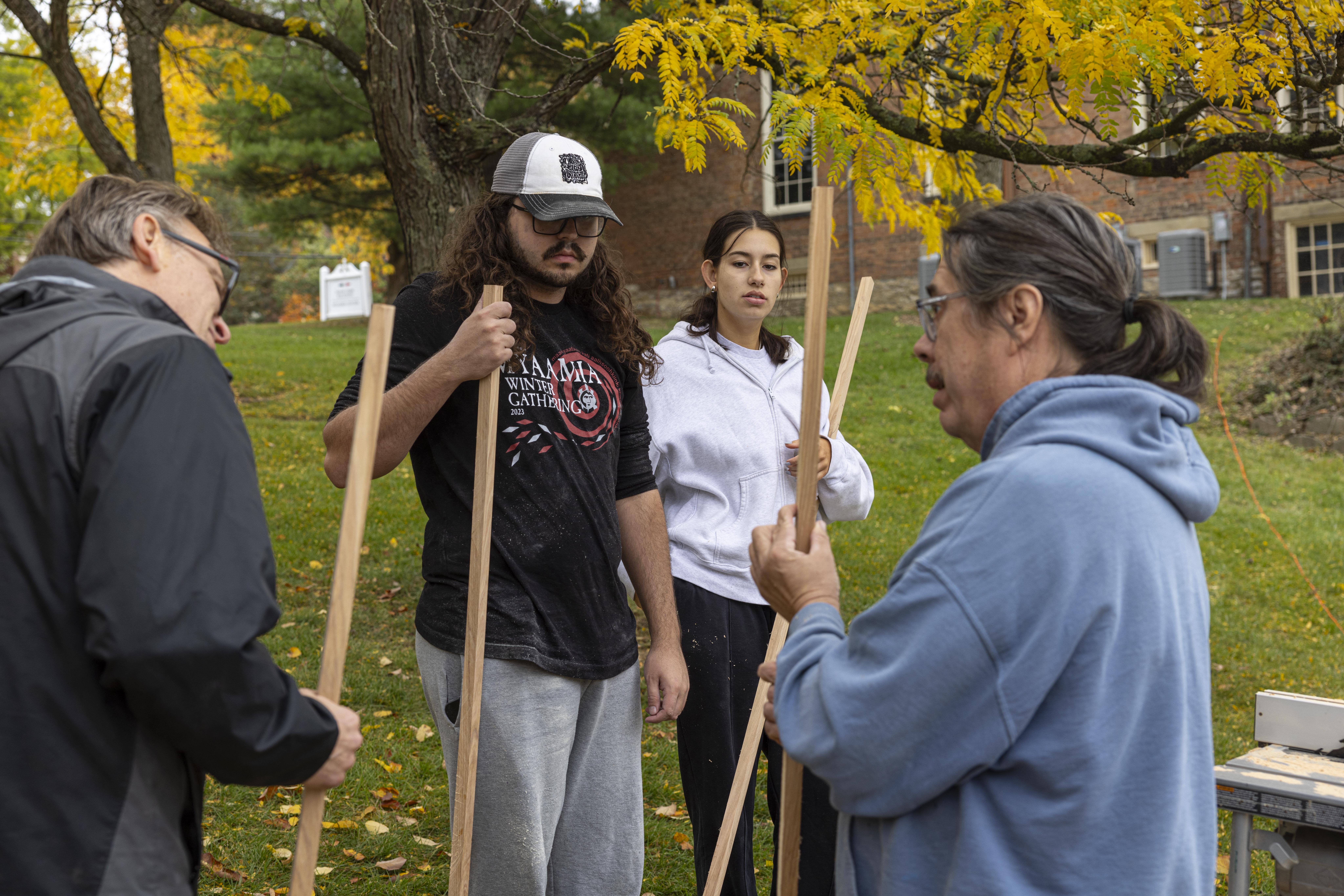 Myaamia students had opportunities to engage in some fun activities outside of the classroom this fall, too. In October, Doug Peconge, from the Miami Tribe’s Cultural Resources Extension Office in Fort Wayne, Indiana, taught a group of students to make pakitahaakana ‘lacrosse sticks.’ Students learned each step of the process, from selecting and preparing the wood to lacing the net used to catch the ball. We’re grateful to Doug for taking the time to travel to campus to teach us this skill.