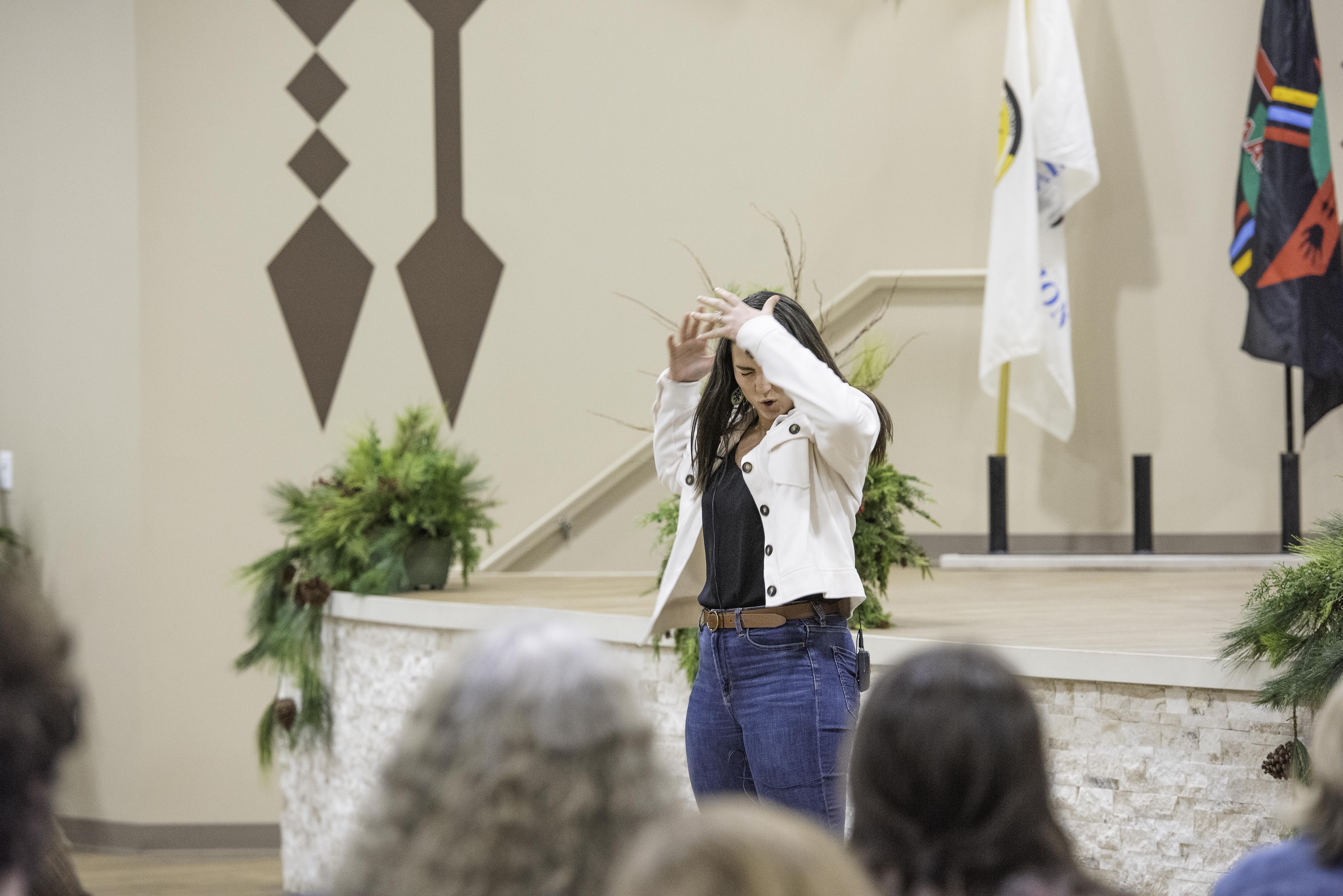 Friday afternoon was spent listening to various presenters share the work they have been doing with the Myaamia community. Presentations included the announcement of an upcoming lunar calendar publication by the Cultural Resource Office. Jamie Jacobs, an artist from the Tonawanda Seneca Nation, talked about the history and impact of quillwork and gifted a piece of quillwork to Akima Lankford on behalf of the Tribe. Additionally, Michael Galban (Washow and Mono Lake Paiute) spoke about the history of wampum among the Seneca Nation and its connection to the Myaamia people. Michael concluded by gifting 300-year-old Seneca wampum to Akima Lankford. Diane Hunter also presented on her experience working as the Tribal Historic Preservation Officer for the past 9 years. After, she was honored by Tribal leadership for her commitment to the Myaamia community.