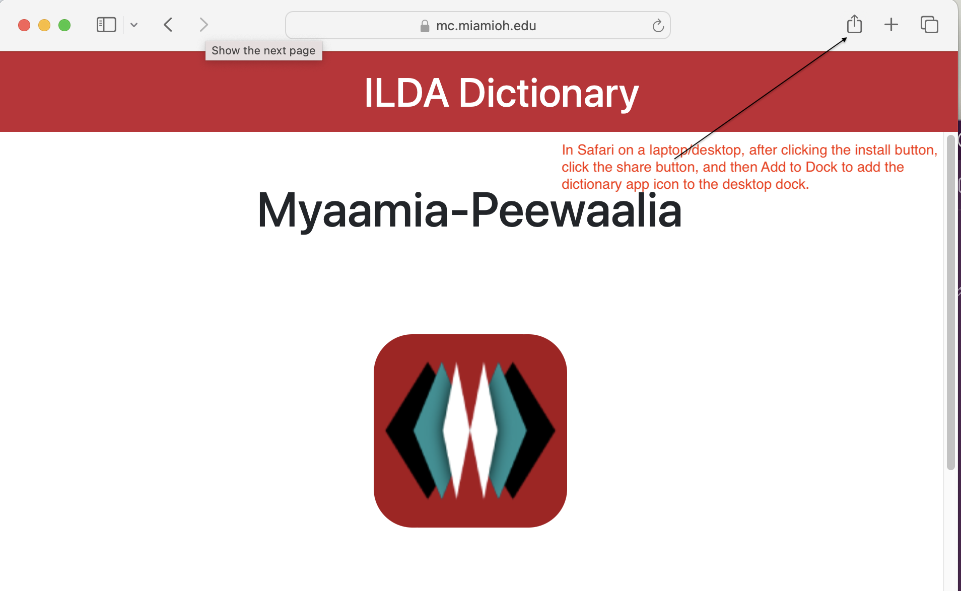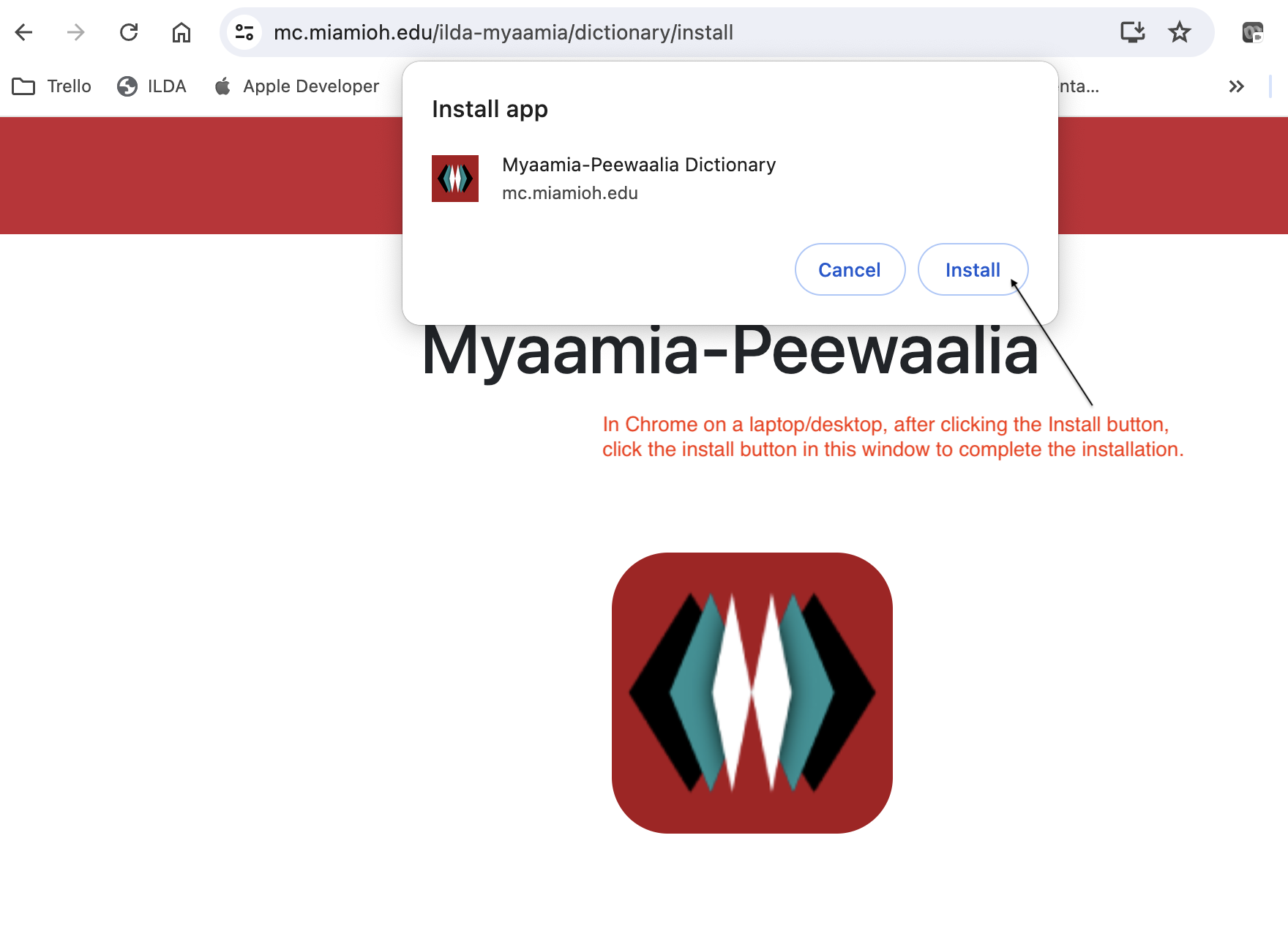 - Visit mc.miamioh.edu/ilda-myaamia/dictionary/install and click the “install” button on the page.