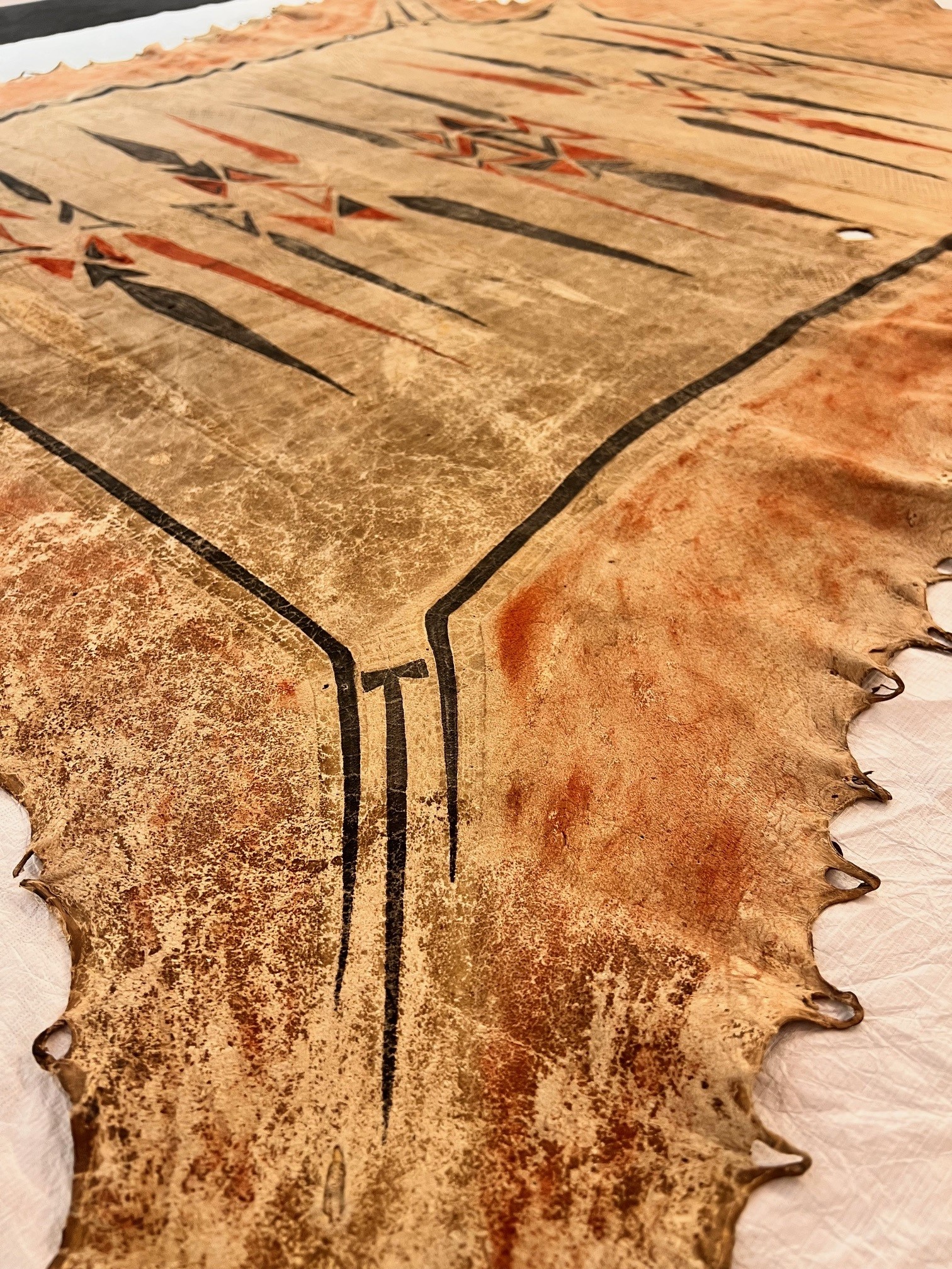 All four hides possessed similar qualities of precise lines and geometric shapes filled with color. The spaces between the colored shapes were often filled with lines painted with clear binder, the glue-like liquid that is used to make paint. These sections decorated with shapes and lines of clear paint likely reflected light and produced an eye-catching shining effect.