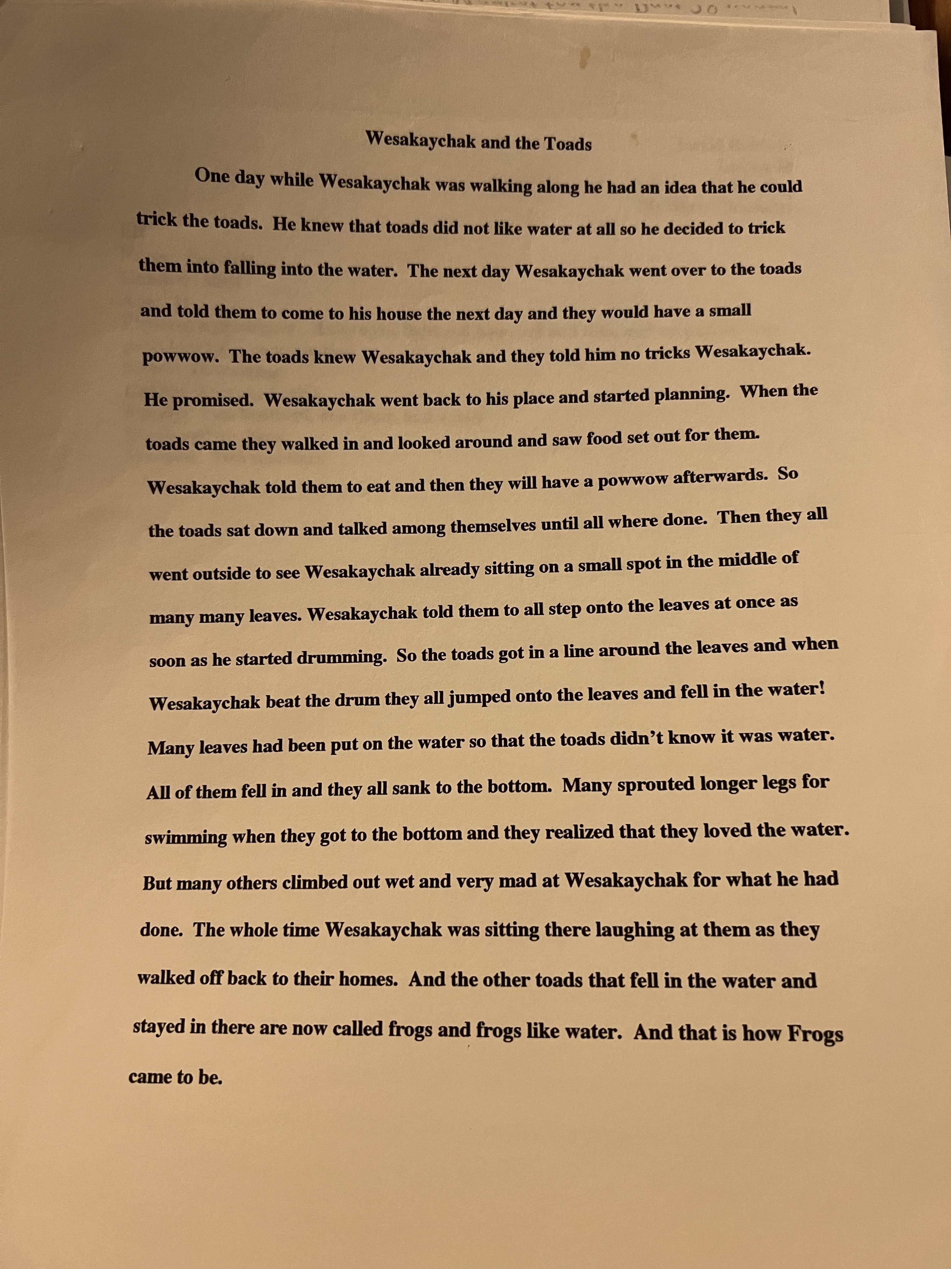 Some of you heard the weehki Aalhsoohkani ‘new Winter Story’, I told at Winter Gathering in January. Wiihsakacaakwa plays his usual bored and spunky self off in search of someone (Mamahkiihsia ‘Toad’) to trick. This story took a long time to write, not only the practical side of sitting down, writing, editing, and translating but also the other side that includes learning about Myaamia storytelling and the character Wiihsakacaakwa. When our language stopped being spoken in the community, Winter Storytelling went with it. In more recent years, the practice has started to be revitalized, along with a relearning of our stories and characters.