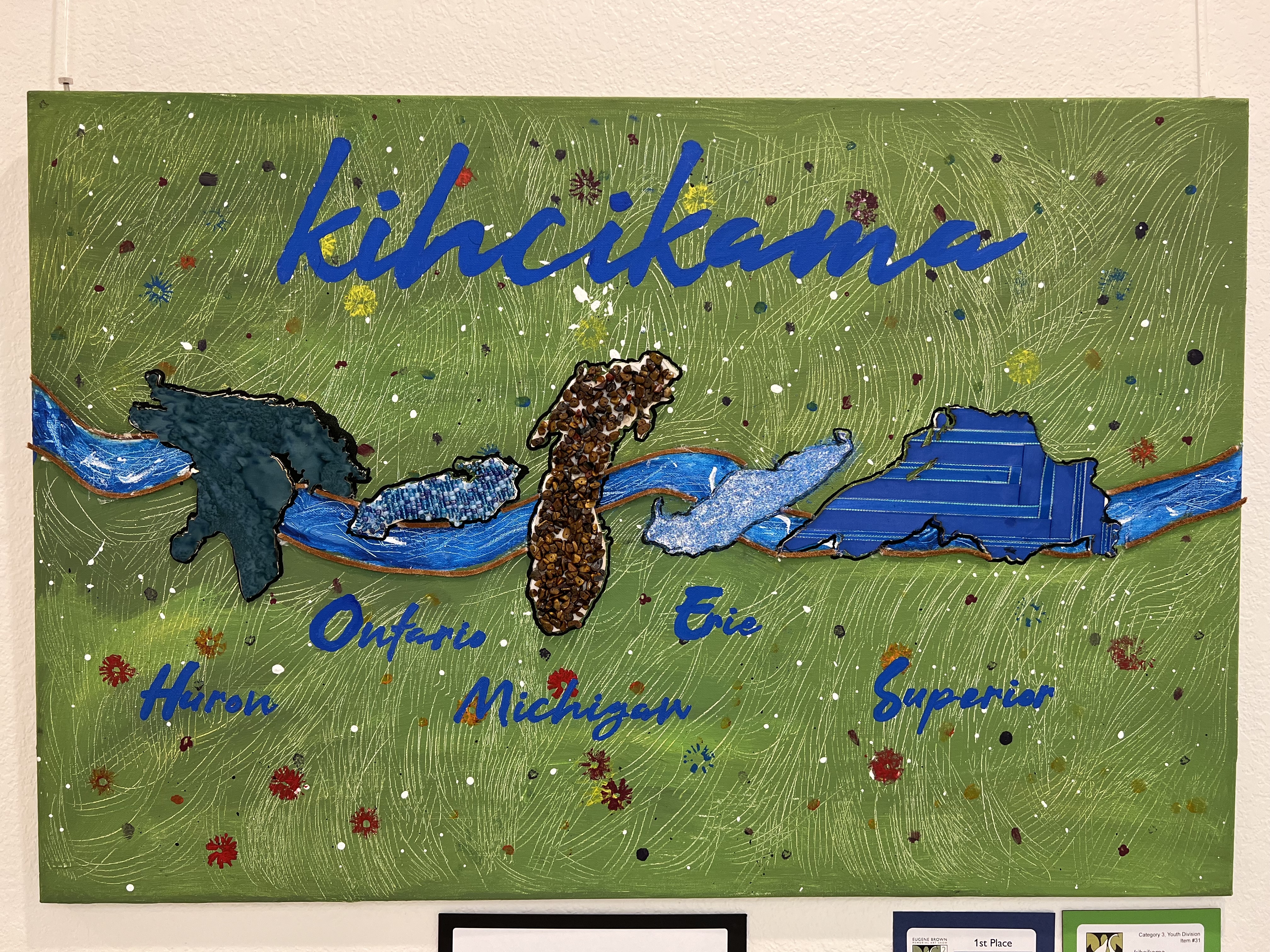 “For the Great Lakes painting [Kihcikama], I learned how to make a flower out of a straw from a video. You make it by cutting a part of it and then spreading it out and just sticking it into the paint. You stamp it down with paint on it and it looks kind of just like a flower.”