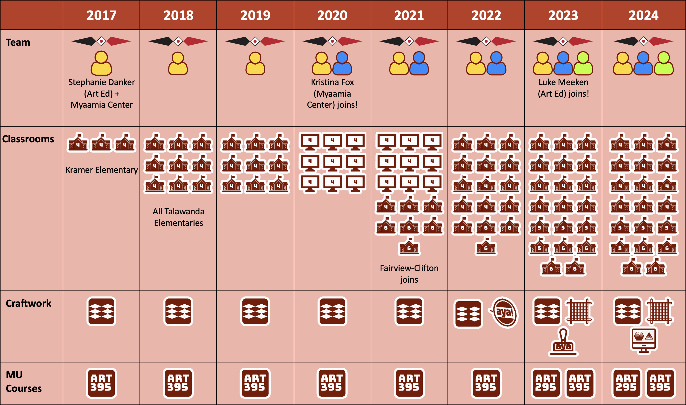 As of fall 2024, over 2,500 youth have participated in learning experiences focused on Myaamia art and culture. These include the classroom lessons developed by over 100 preservice art educators as well as adaptations of those lessons for community organizations, such as local Girl Scout troops in collaboration with the Richard and Carole Cocks Art Museum in Oxford.