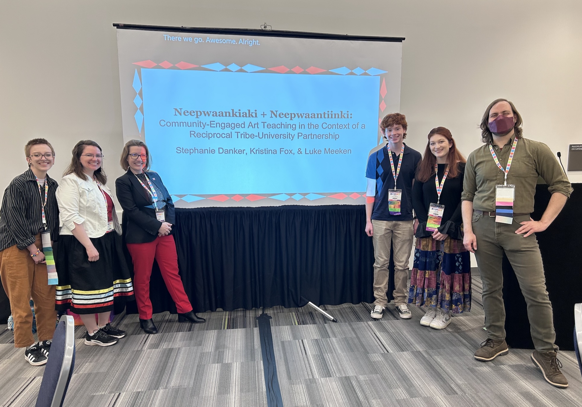 The impact of this work continues to resonate beyond graduation, as preservice art educators regularly reach out to share how it has shaped their teaching. At the 2025 Preservice Art Education Conference, Stephanie moderated a panel with three MACEP alumnae and one current student. The alumnae, Molly Ensor, Ally McLean, and Kalee Grayson, acted as mentors to the class following their cohort, and the current student, Hal Loomis, was in the first cohort to participate in two semesters of the program. Molly shared how her MACEP experience has informed how she engages with Indigenous art and artists in her classroom. Hal shared how engaging in this work across two years (and two consecutive trips to Winter Gathering) has allowed him to meaningfully incorporate Myaamia culture in curriculum.