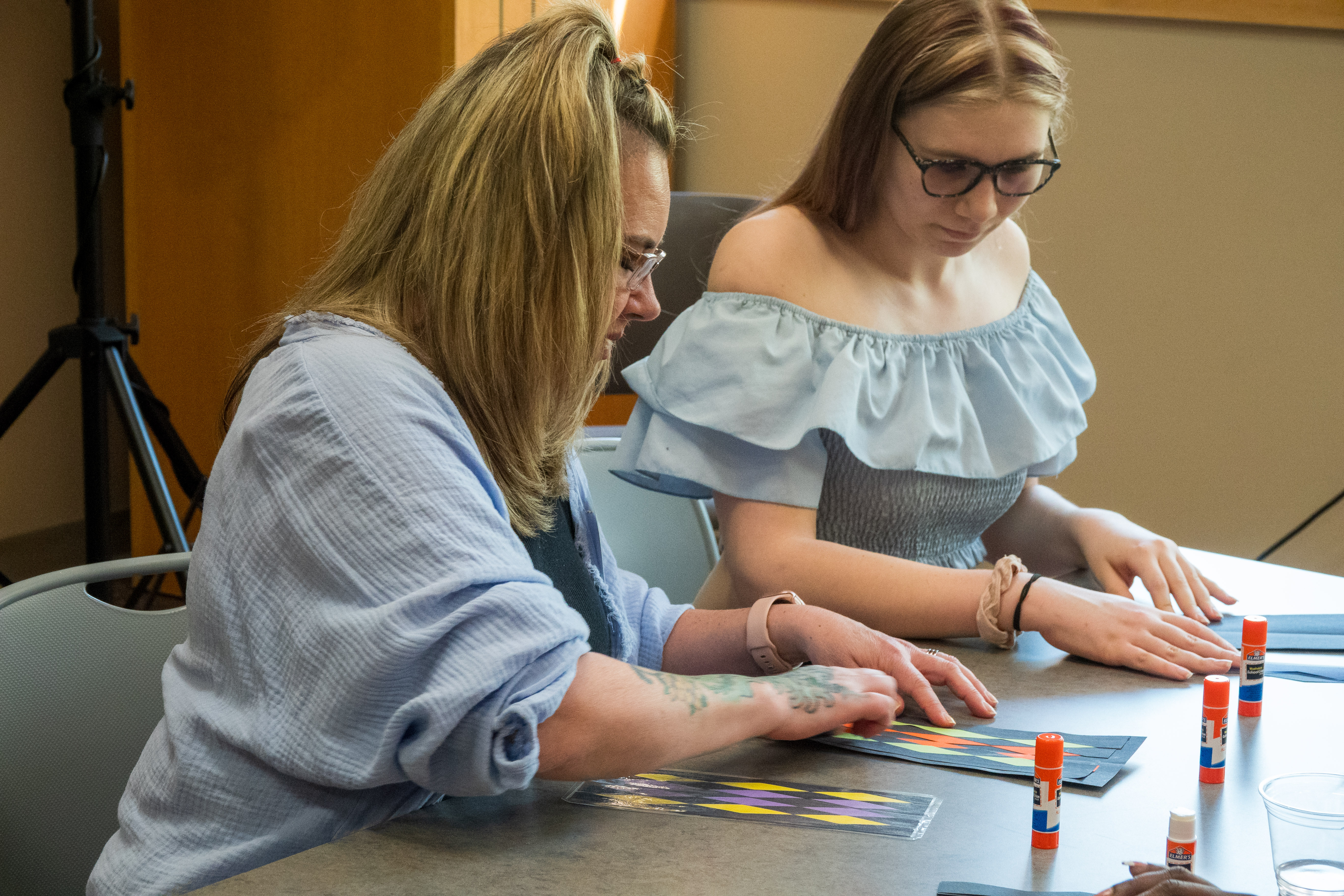 A homeschool class made ribbonwork bookmarks and laughed at Cathy Mowry’s depiction of Fox tricking Wolf.