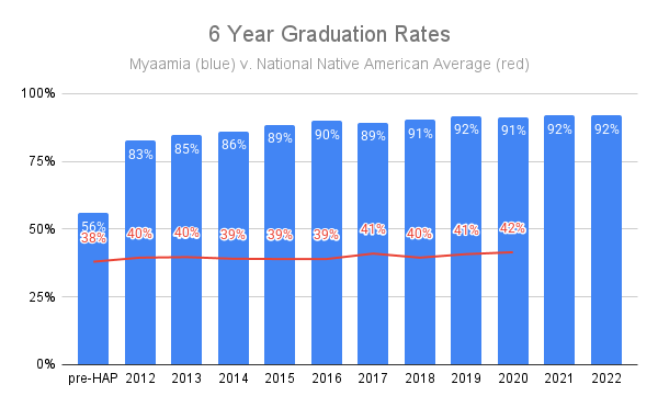 The first outcome, academic attainment, is always my favorite to talk about at conferences because I get to share our flashy statistics that never fail to impress. Myaamia students have been attending Miami University as part of the HAP since 1991. However, the actual courses tied to the HAP as we know it today didn’t start until 2001. This offers us the opportunity to compare graduation rates between 1991-2001 (where students received a tuition waiver, but no Myaamia educational curriculum) with those since 2001 (where students receive both a tuition waiver and Myaamia educational curriculum). Theoretically, the primary (though admittedly not only) difference between these two groups is the inclusion of the curricular and extracurricular components offered by staff at the Myaamia Center.
