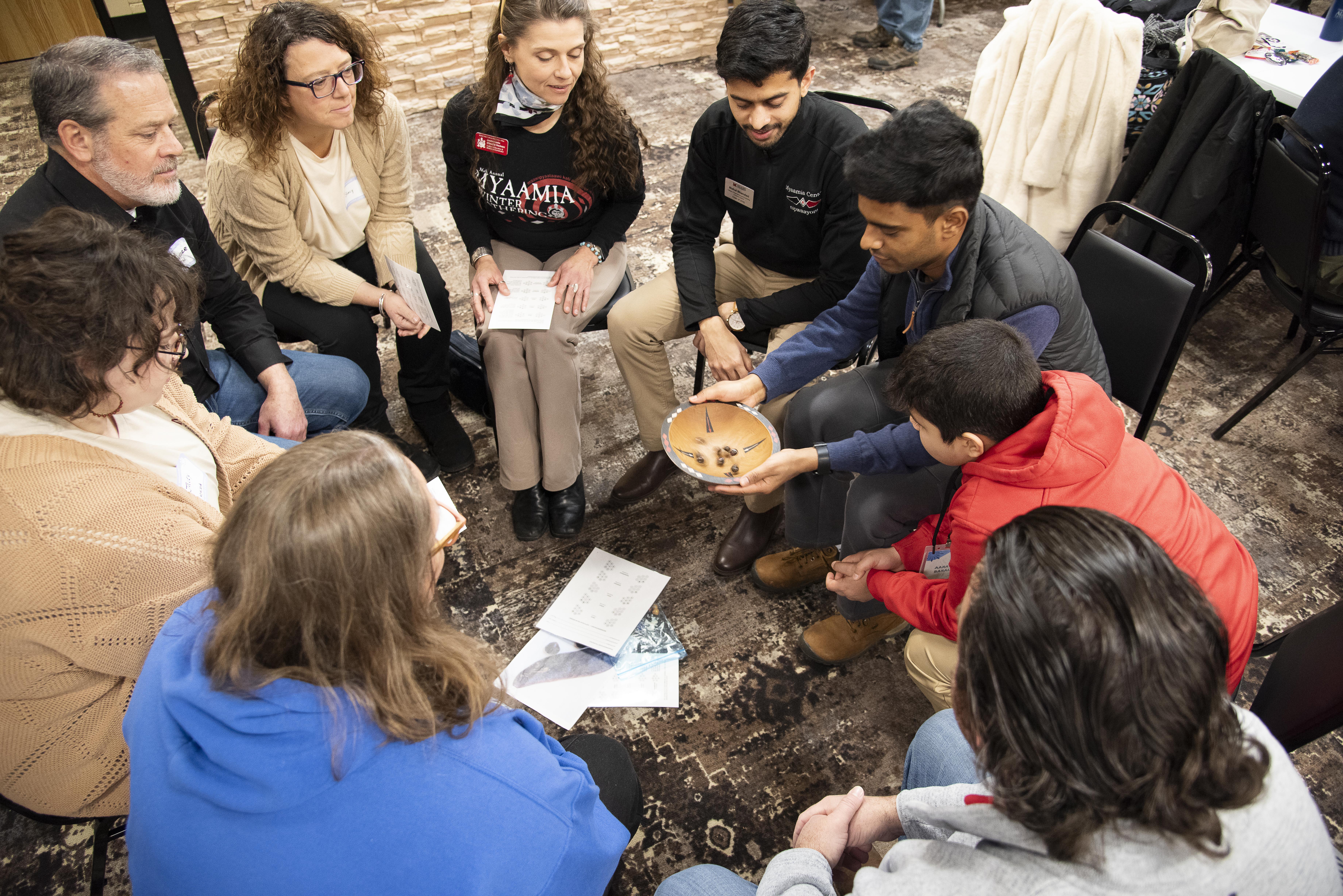 In addition to participating in Stomp Dances and listening to Winter Stories, tribal leadership shared information about the return of an 18th-century quillworked bag that once belonged to Akima Mihšihkinaakwa ‘Chief Little Turtle’, the Tribe’s developing relationship with Strawtown Koteewi Park in Indiana, and the 25th anniversary of the Myaamia Center at Miami University.