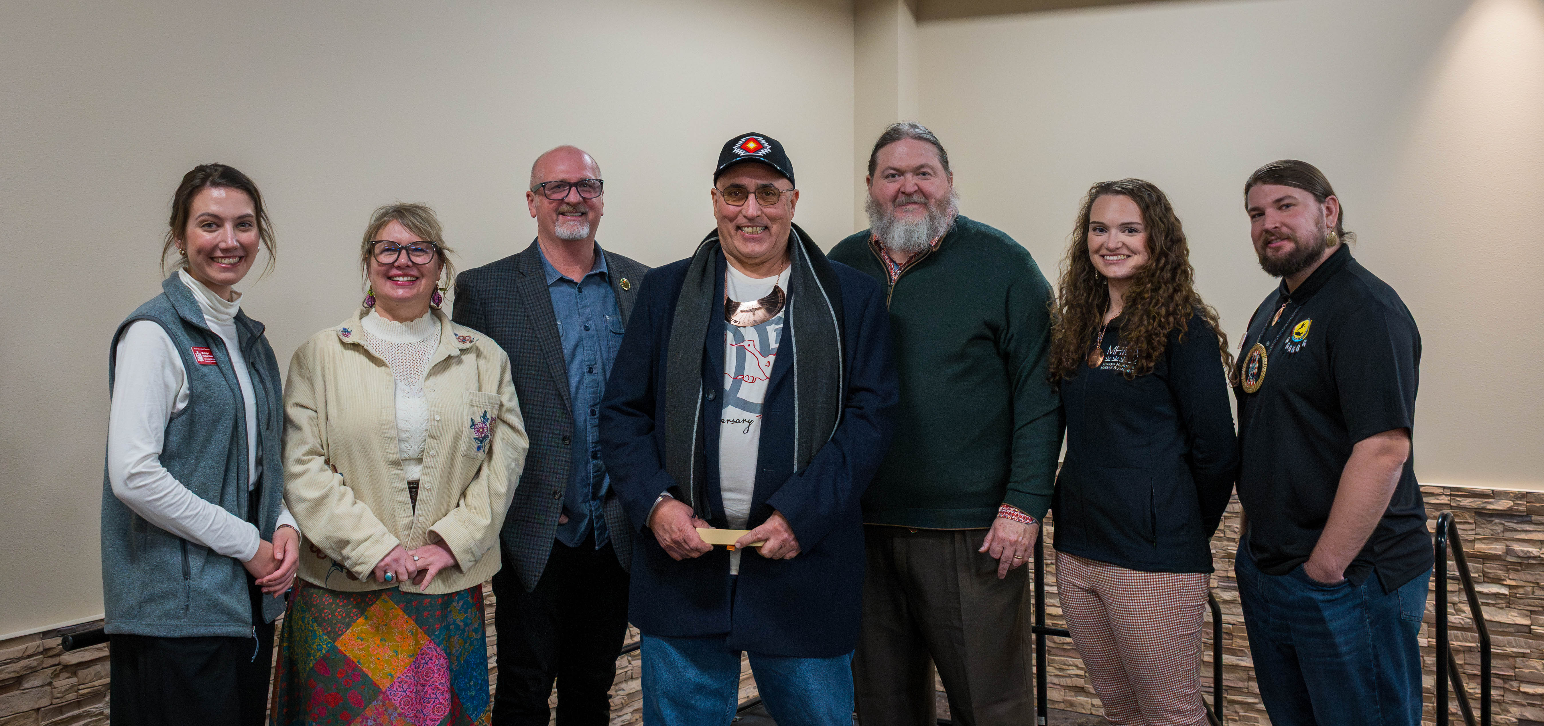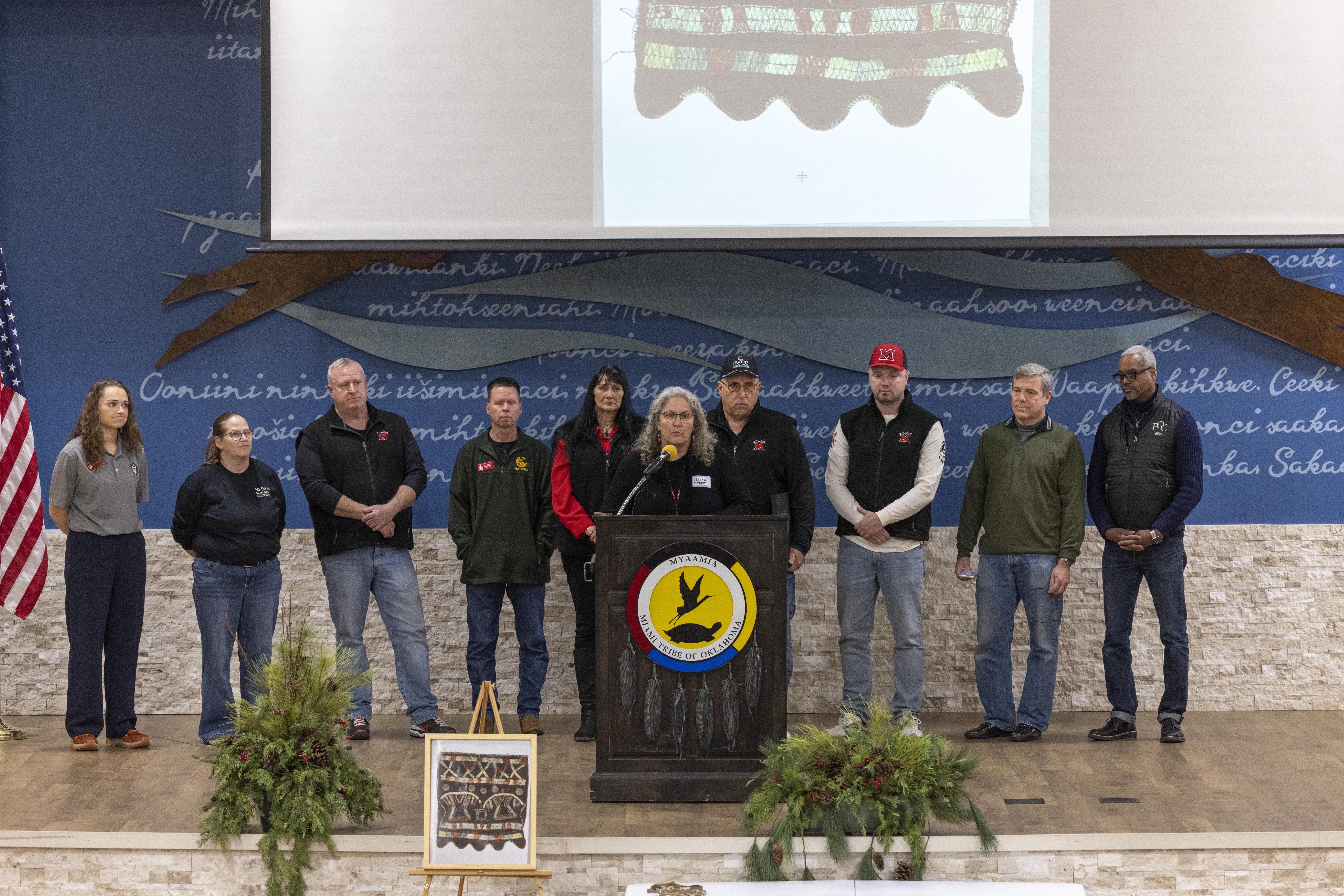 Before dinner and storytelling on Friday evening, leadership and staff from the Miami Tribe were joined on stage by representatives from Fort Orange Club, a country club in Albany, New York. This club had been in possession of an 18th-century quilled bag, once belonging to Mihšihkinaakwa.