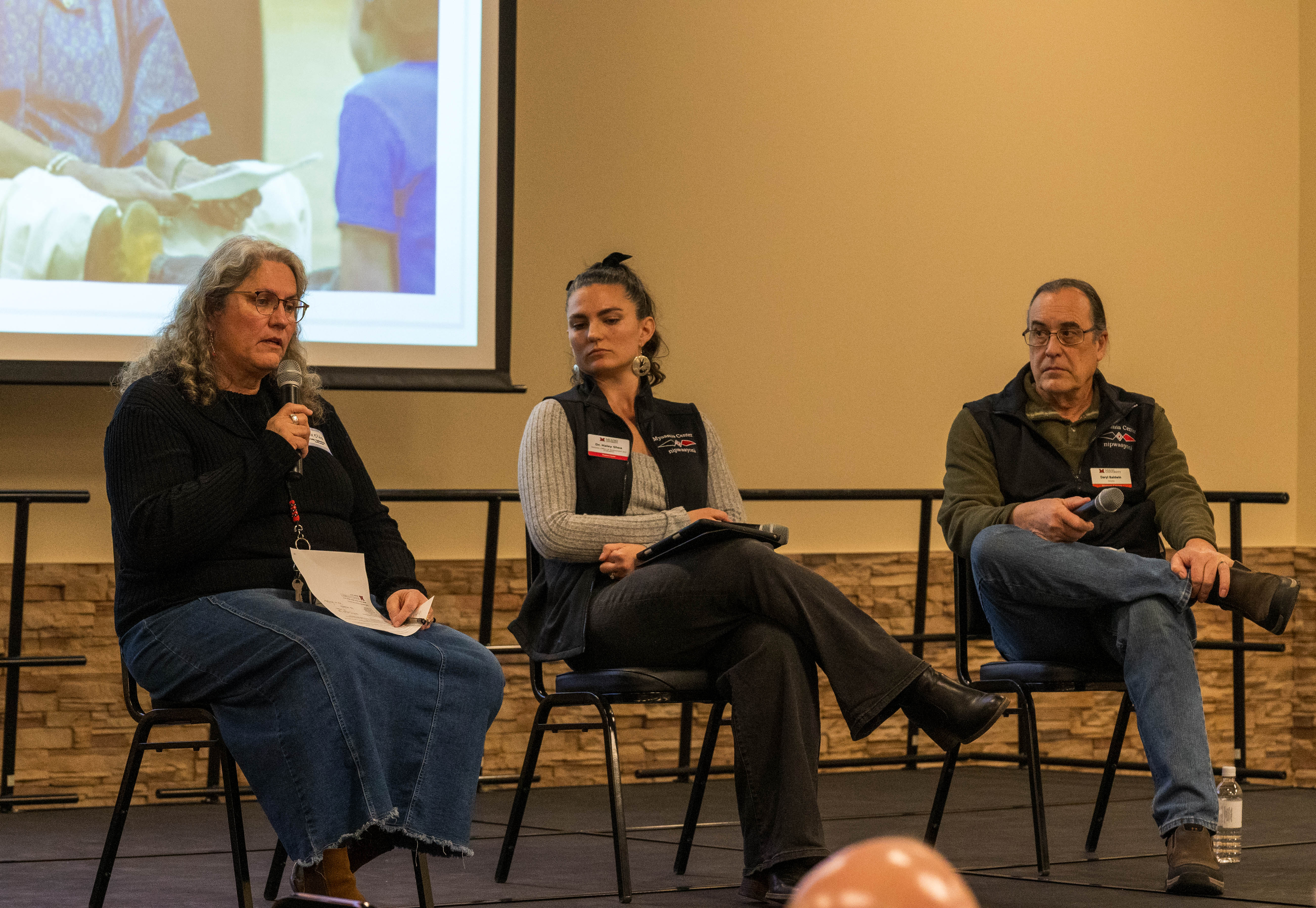 Following Daryl’s announcement, historian Cameron Shriver shared insights on Myaamia education he found while researching for the new book, Our People Believe in Education: the Unlikely Alliance of the Miami Tribe and Miami University. A panel featuring Julie Olds, Haley Shea, and Daryl Baldwin reflected on how the “unlikely alliance” between the Tribe and the University has transformed from a small research project into a cornerstone of the Tribe’s cultural revitalization work.
