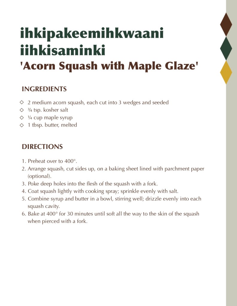 As we gear up for all of the hard work that goes into the making of iihkisaminki ‘maple syrup’ and siihsipaahkwi ‘maple sugar’ this time of year, I want to share a little about the other side of the equation – the eating part. I have memories of little Myaamia kids at a community gathering, running around and eating maple sugar, a sign that this flavor is a cultural favorite. We know that Myaamiaki ‘Myaamia people’ have been eating maple syrup and sugar since time immemorial, and I want to make it just as relevant in our lives today. So let’s dig into how maple syrup and sugar help us on our journey of nahi meehtohseeniwinki ‘living well’.