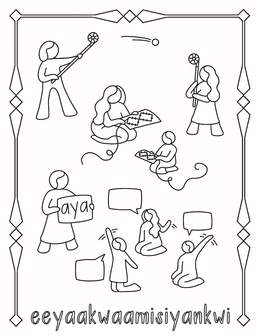 This page features people doing activities and embodying eeyaakwaamisiyankwi ‘we (incl.) make every effort’.